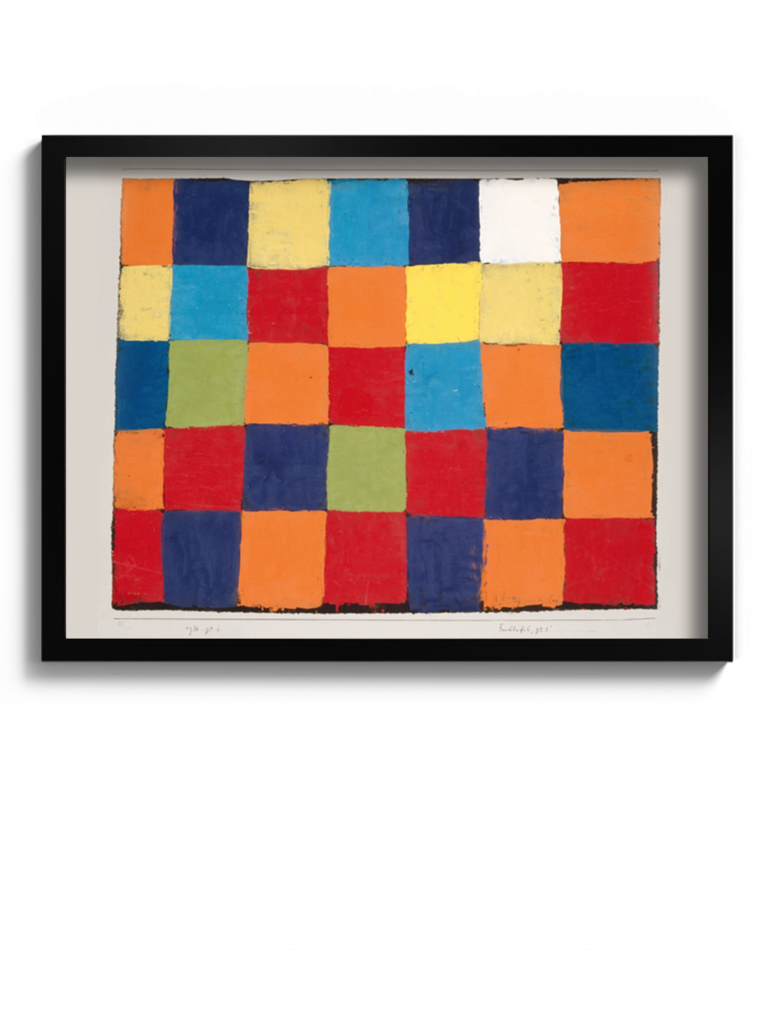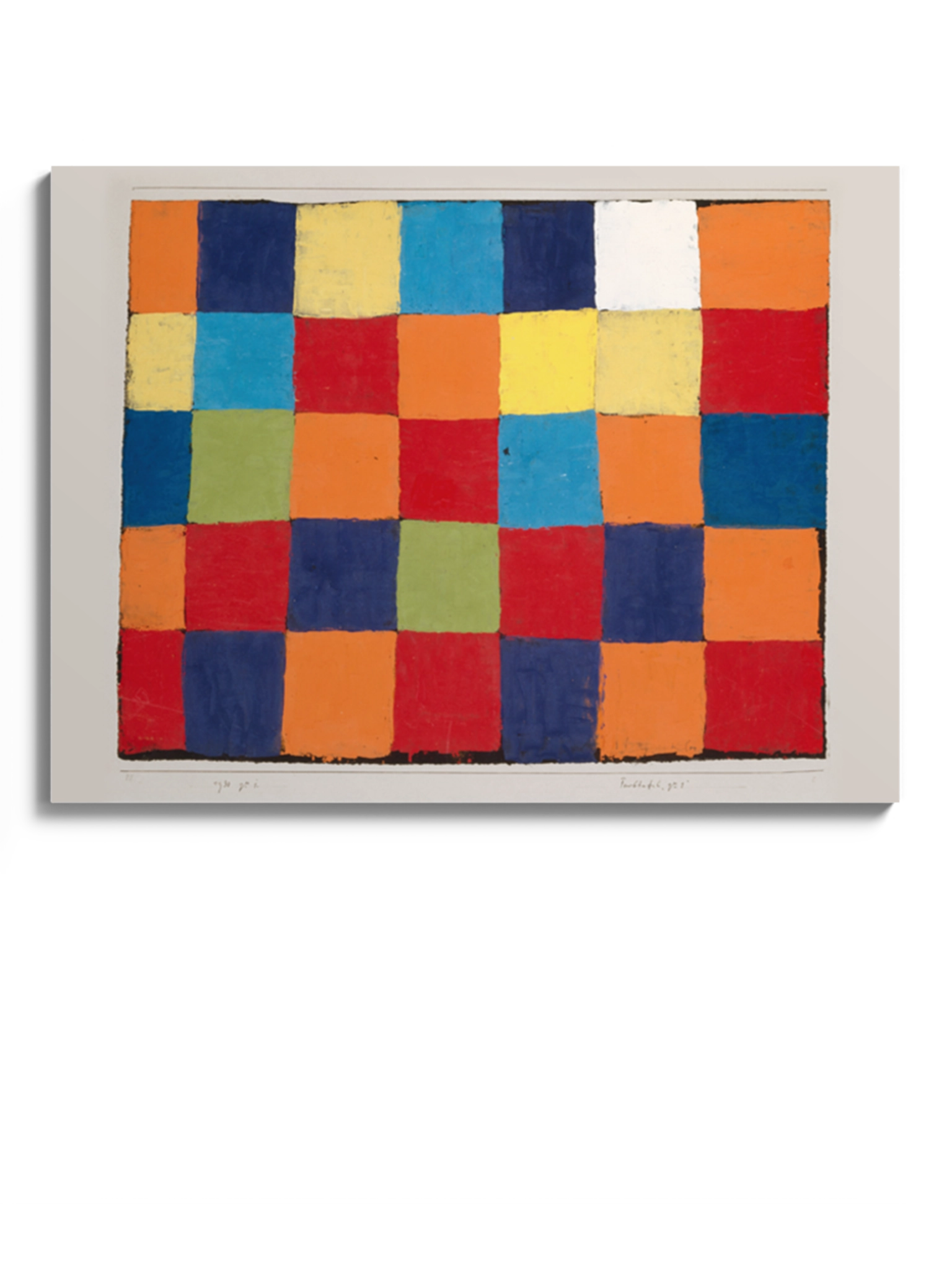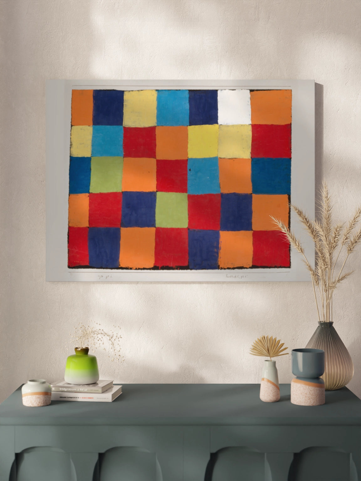 Картина кольорова геометрична абстракція клітинки на полотні, склі та декорпанелі «Колірна діаграма Qu 1». Картина швейцарсько-німецького художника Пауля Клее. Картина стане яскравим акцентом у вітальні, спальні, дитячій кімнаті, офісі або в закладі.