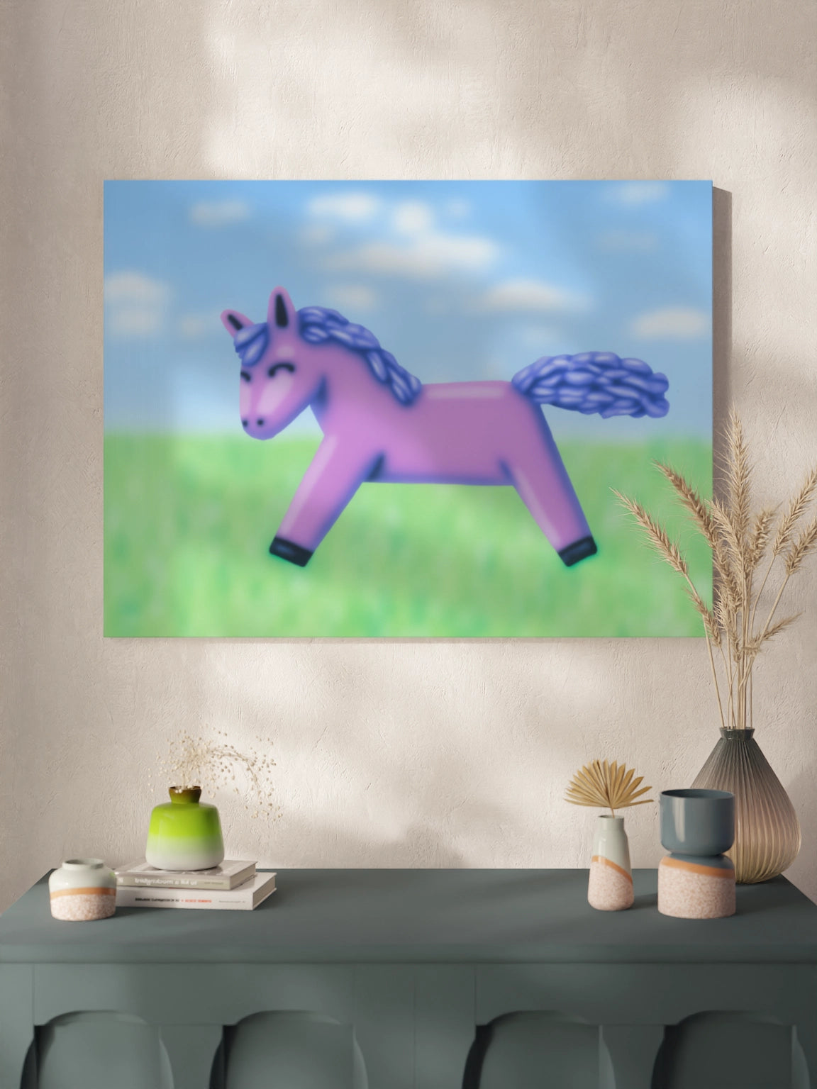 Картина на полотні, склі та декорпанелі «Рожевий поні». Картина в напрямі сучасного мистецтва стане яскравим акцентом у вітальні, спальні, дитячій кімнаті, офісі або в закладі.