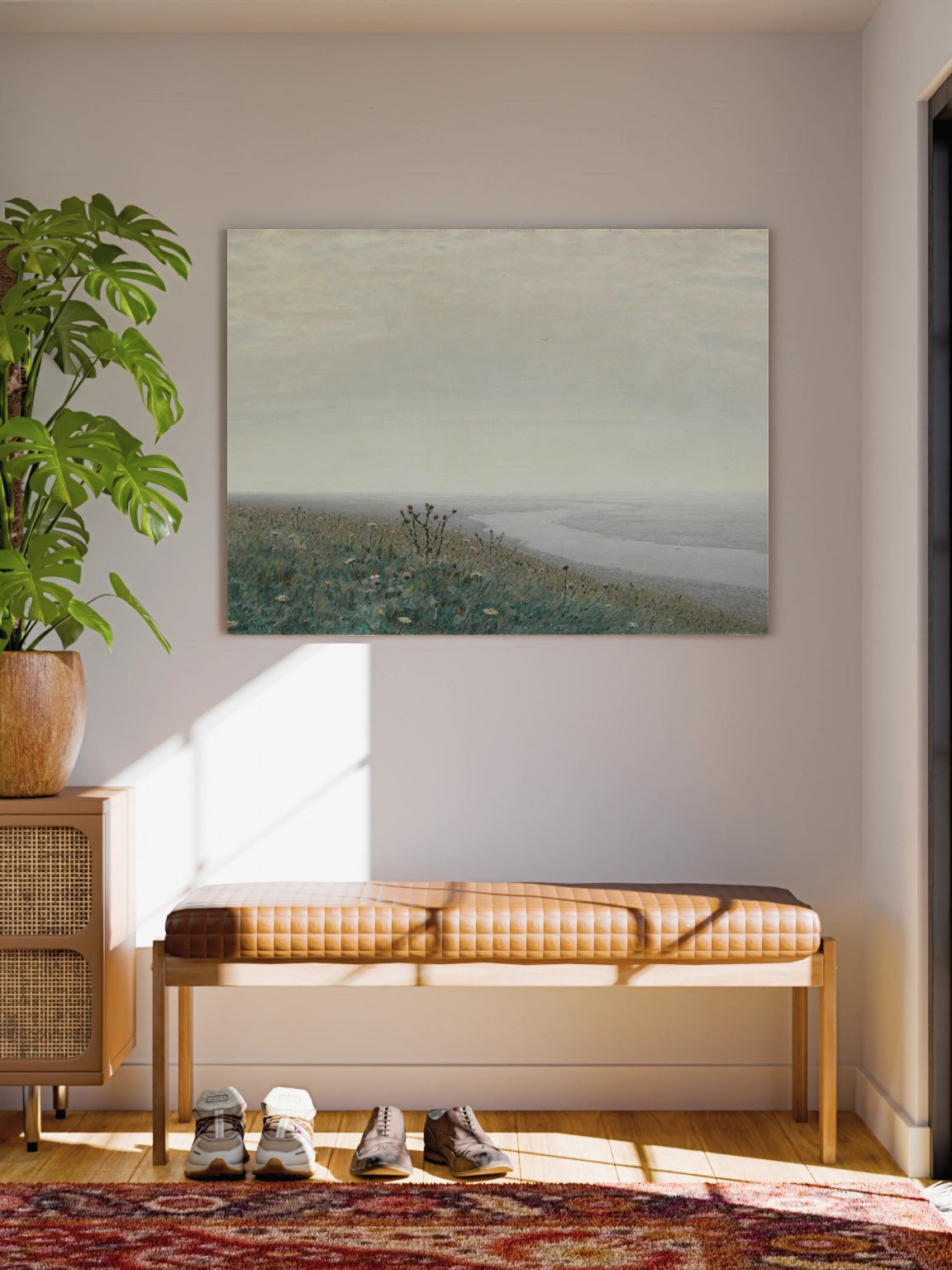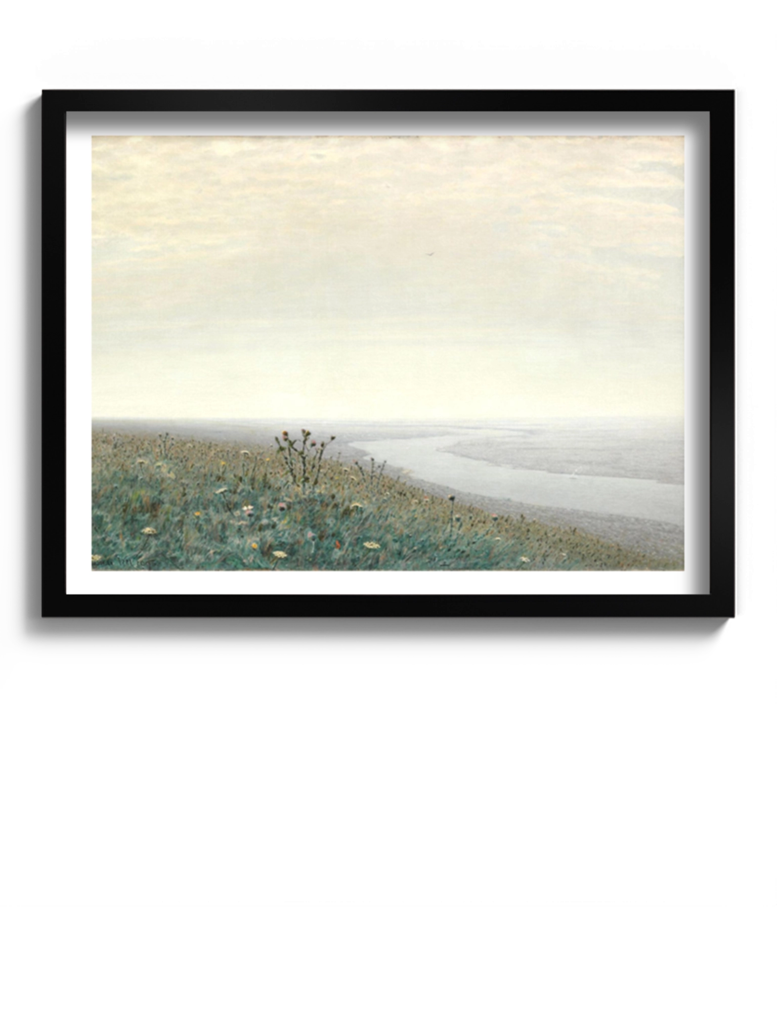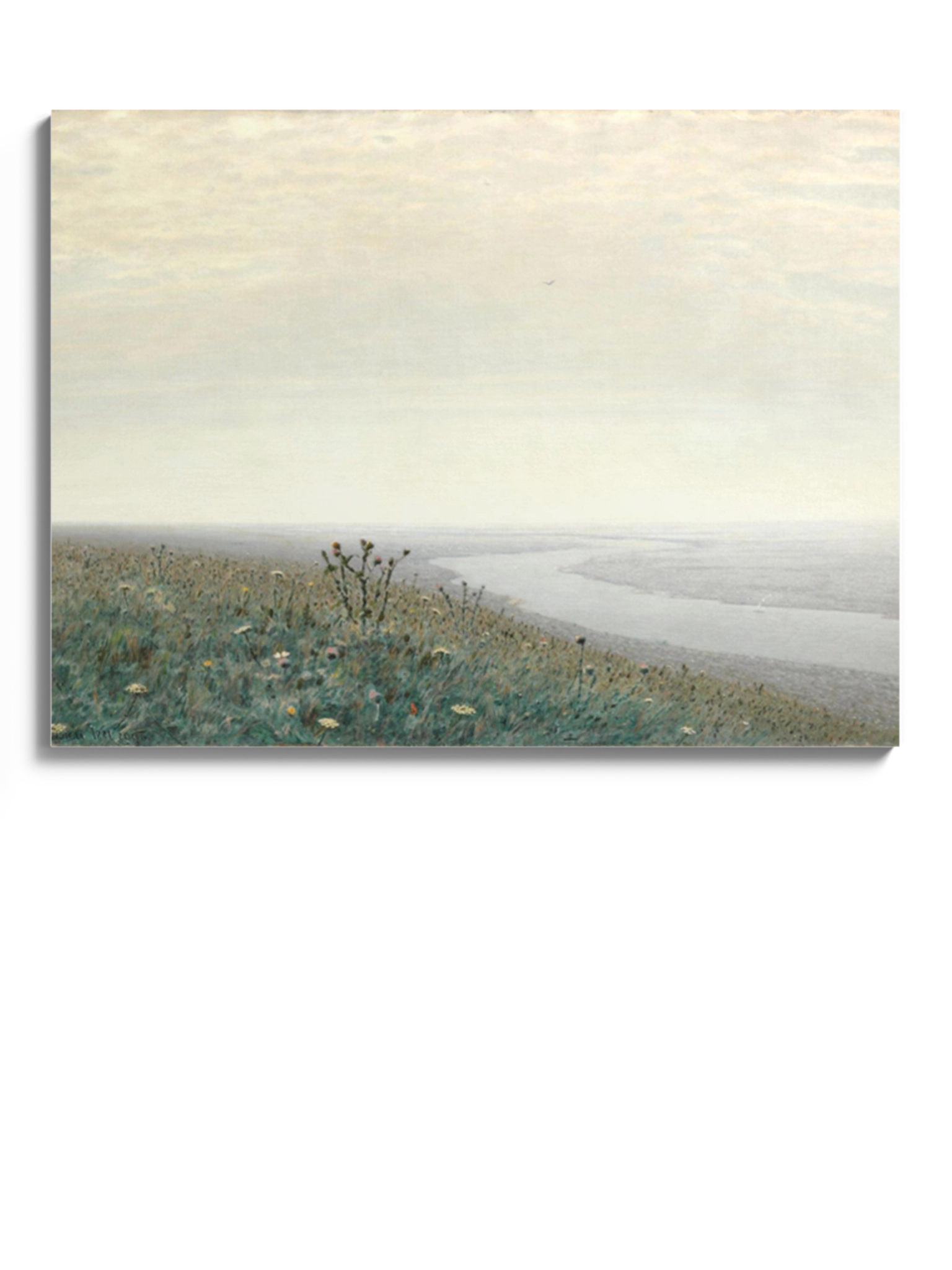 Картина «Дніпро вранці» українського художника Архипа Куїнджі. Пейзаж, білий колір, пастельні кольори, ранок, туман, річка, луг з квітами.