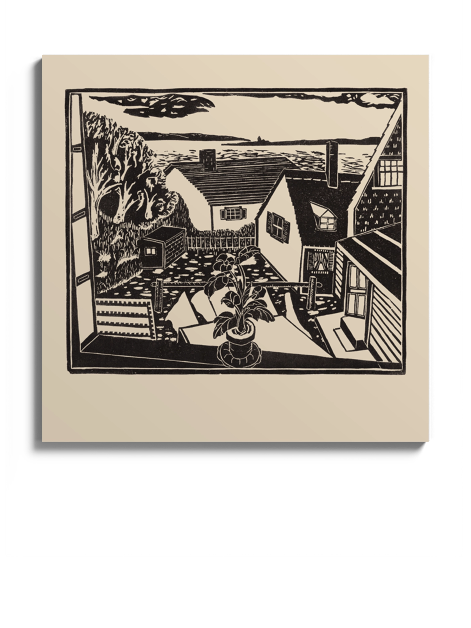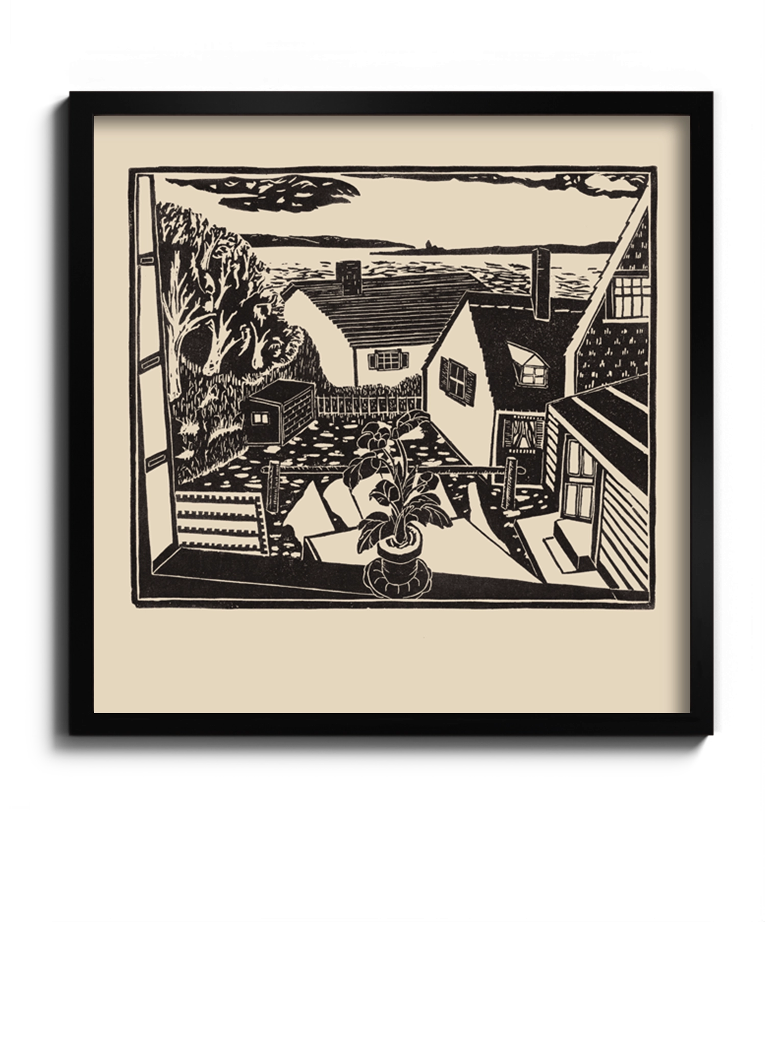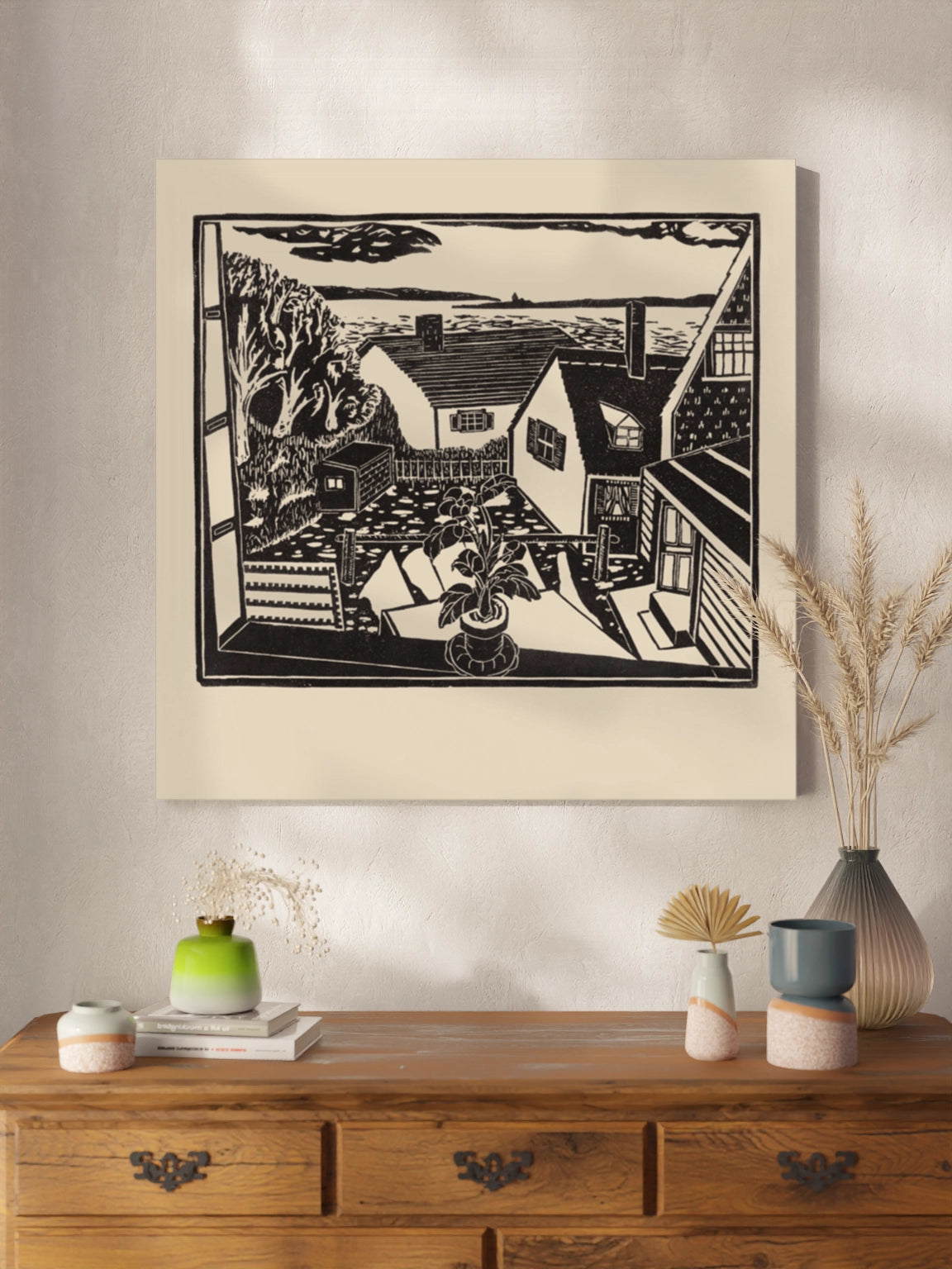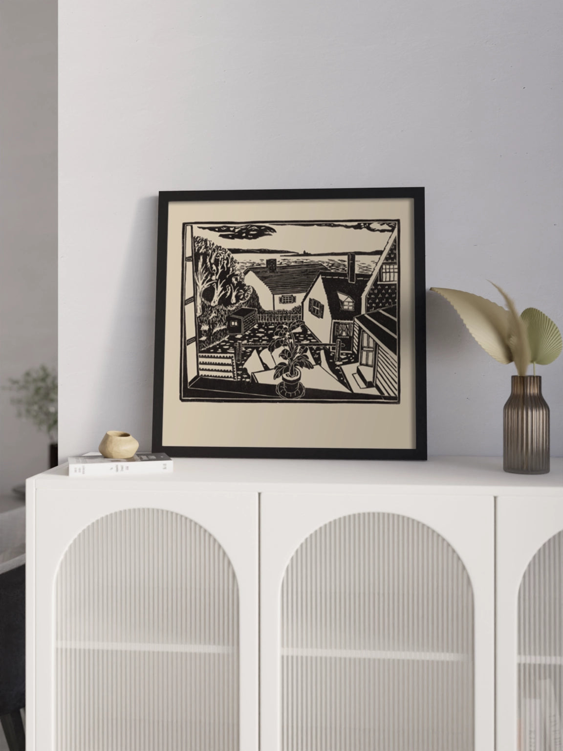 Картина в бежевому кольорі "Подвір'я" канадського художника Blanche Baxter. Графіка, пейзаж, вид з вікна.