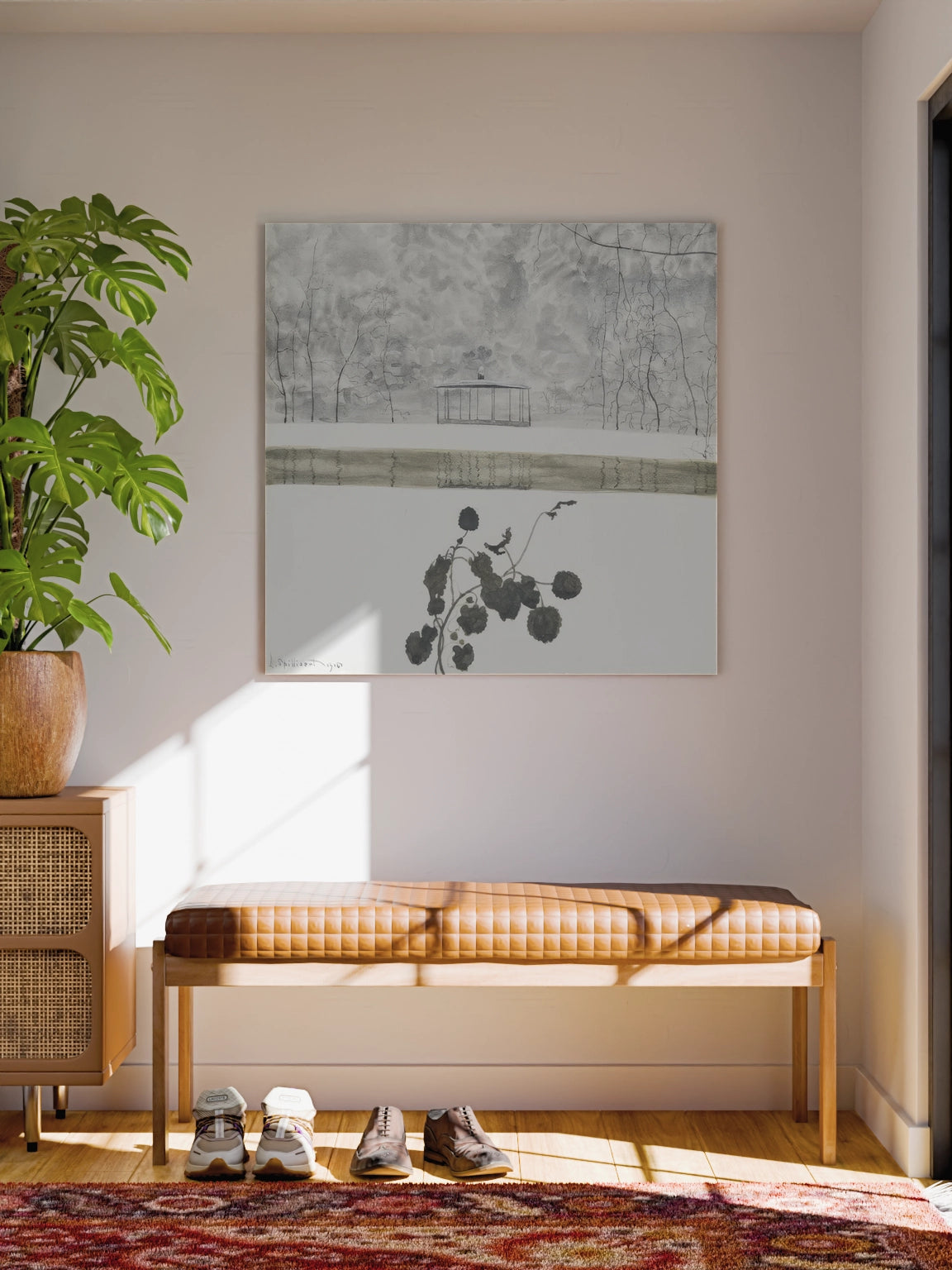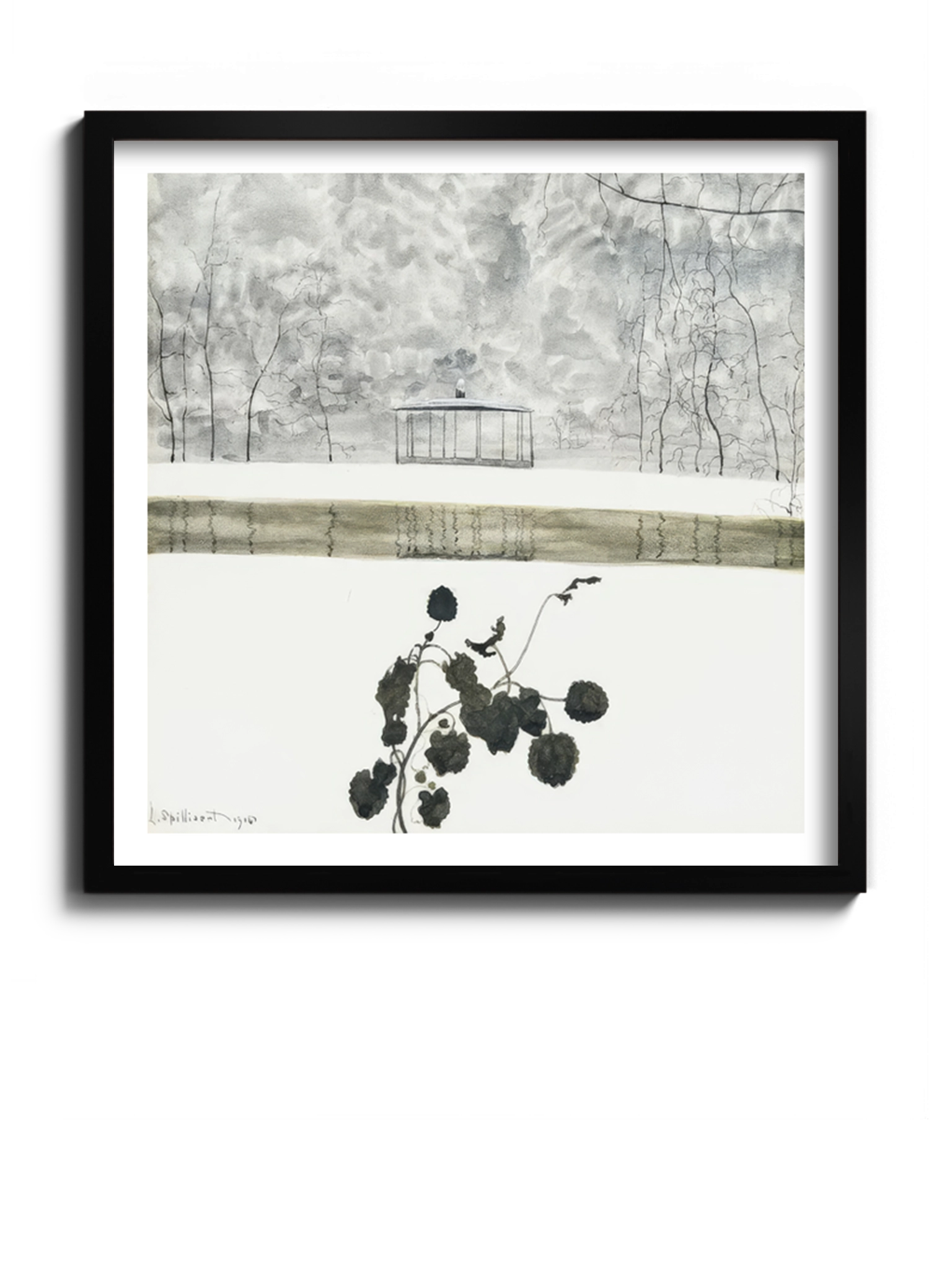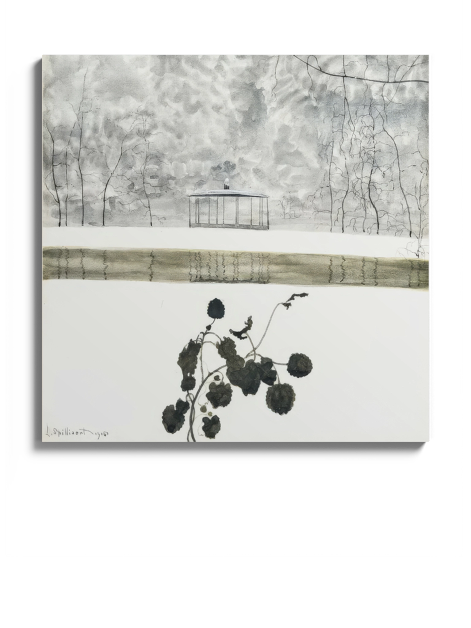 Картина «Сніговий пейзаж з плющем та кіоском» бельгійського кресляра, ілюстратора, літографа і художника Леона Спілліарта. Зимовий пейзаж, сніг, мороз, білий колір, квіти.