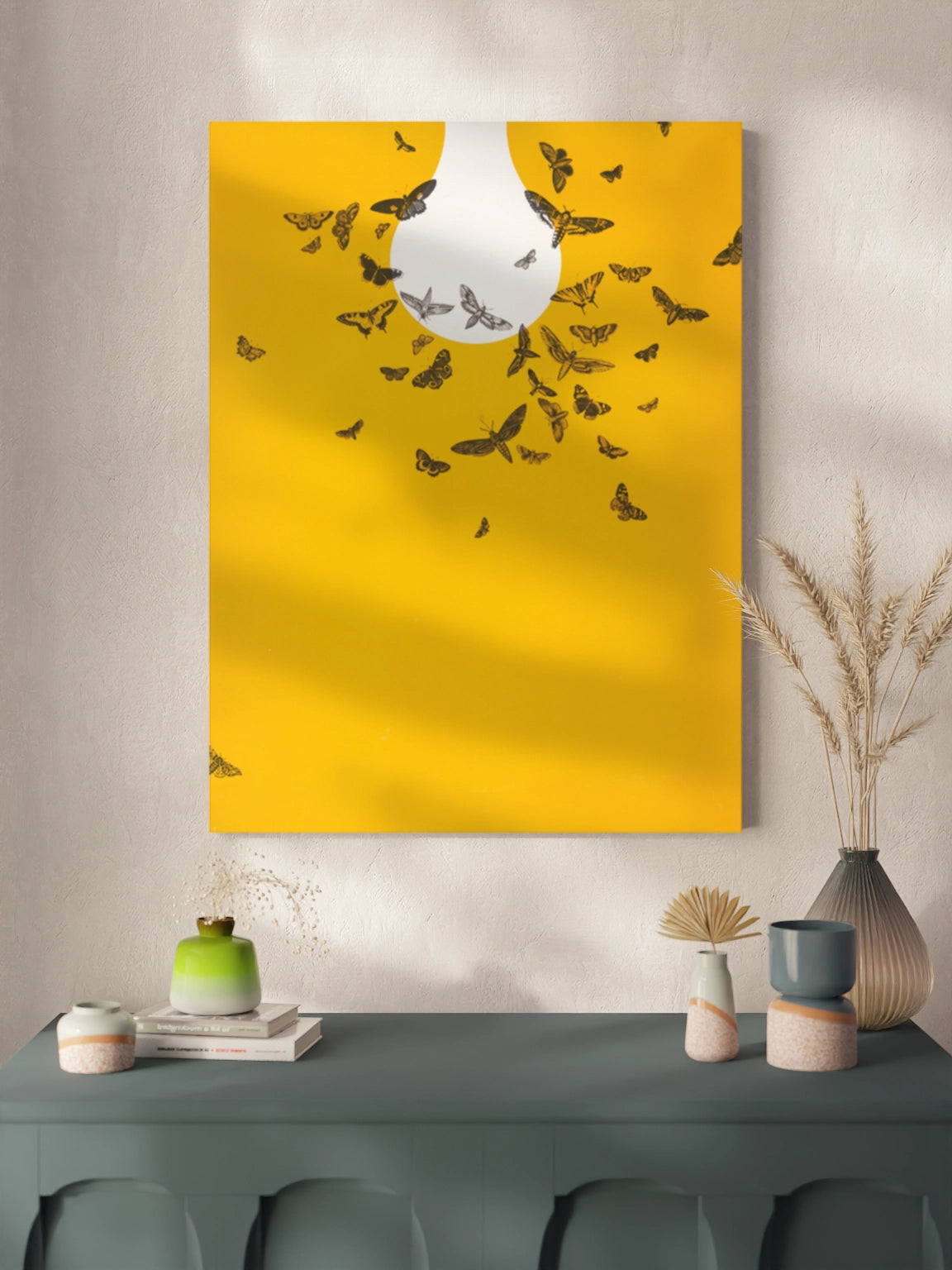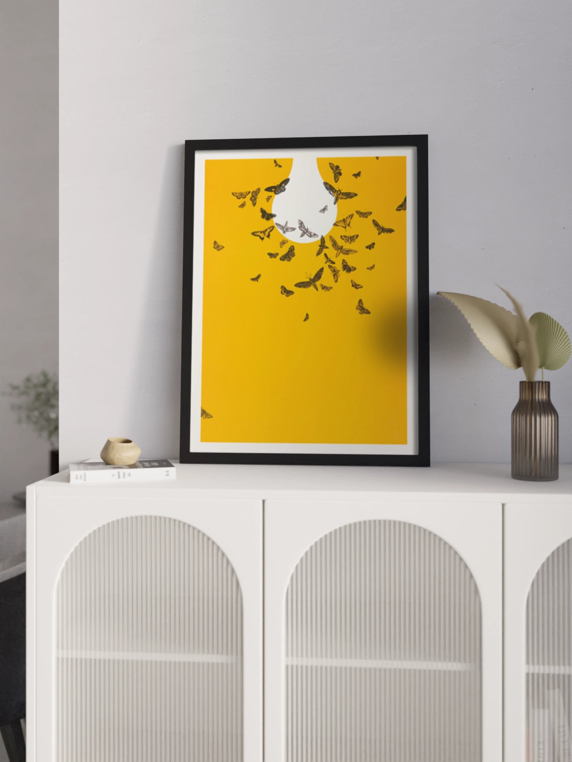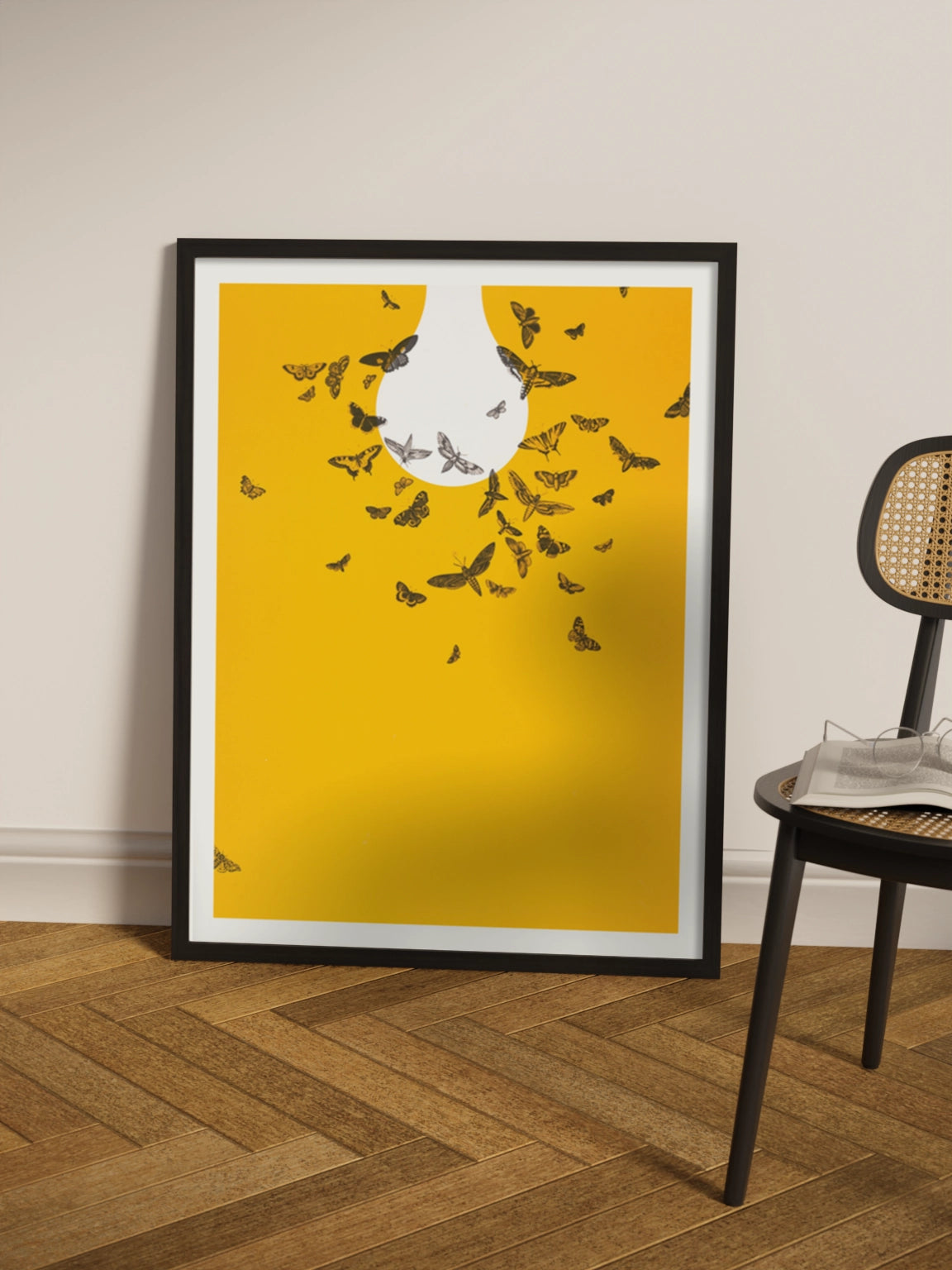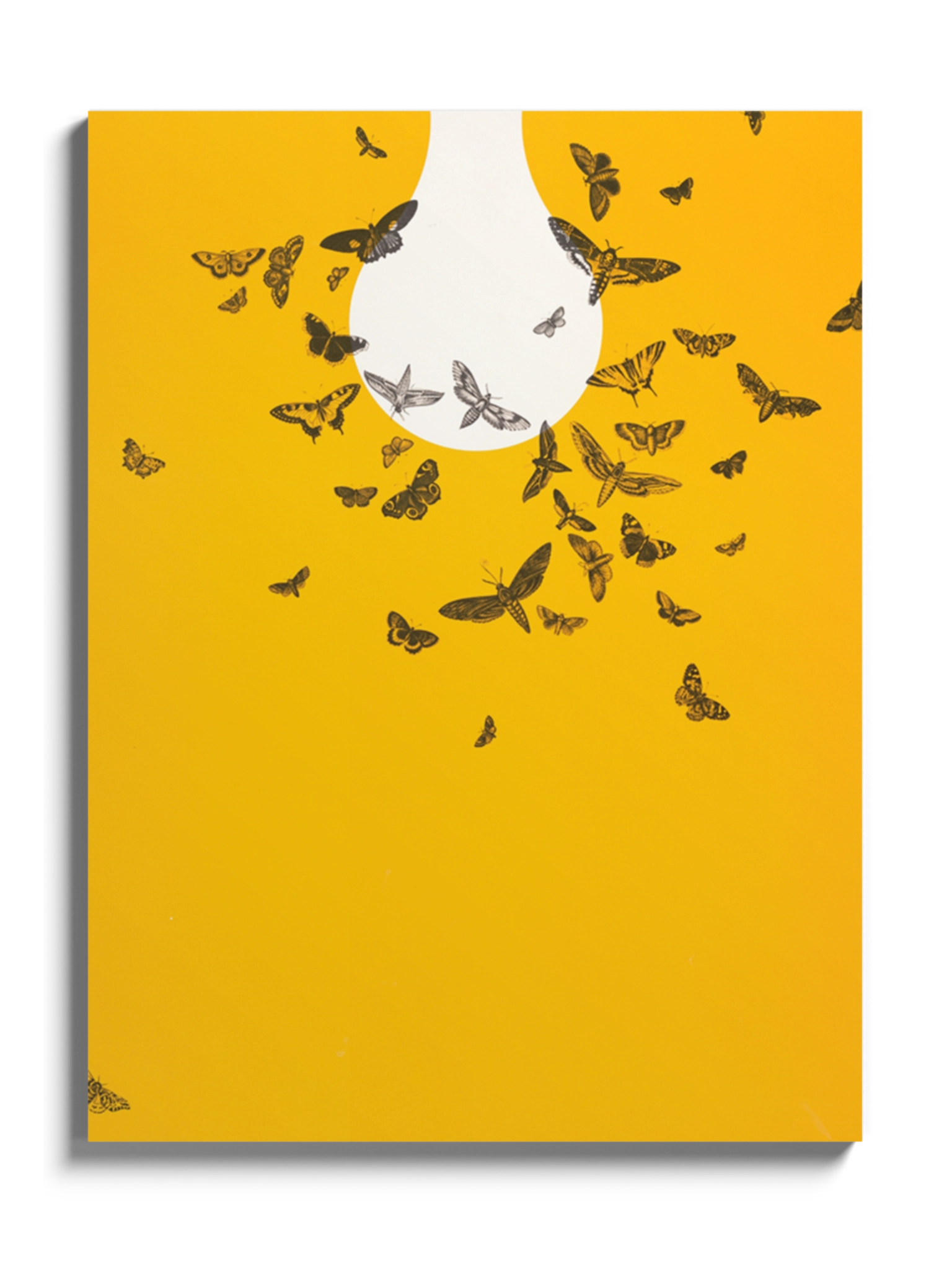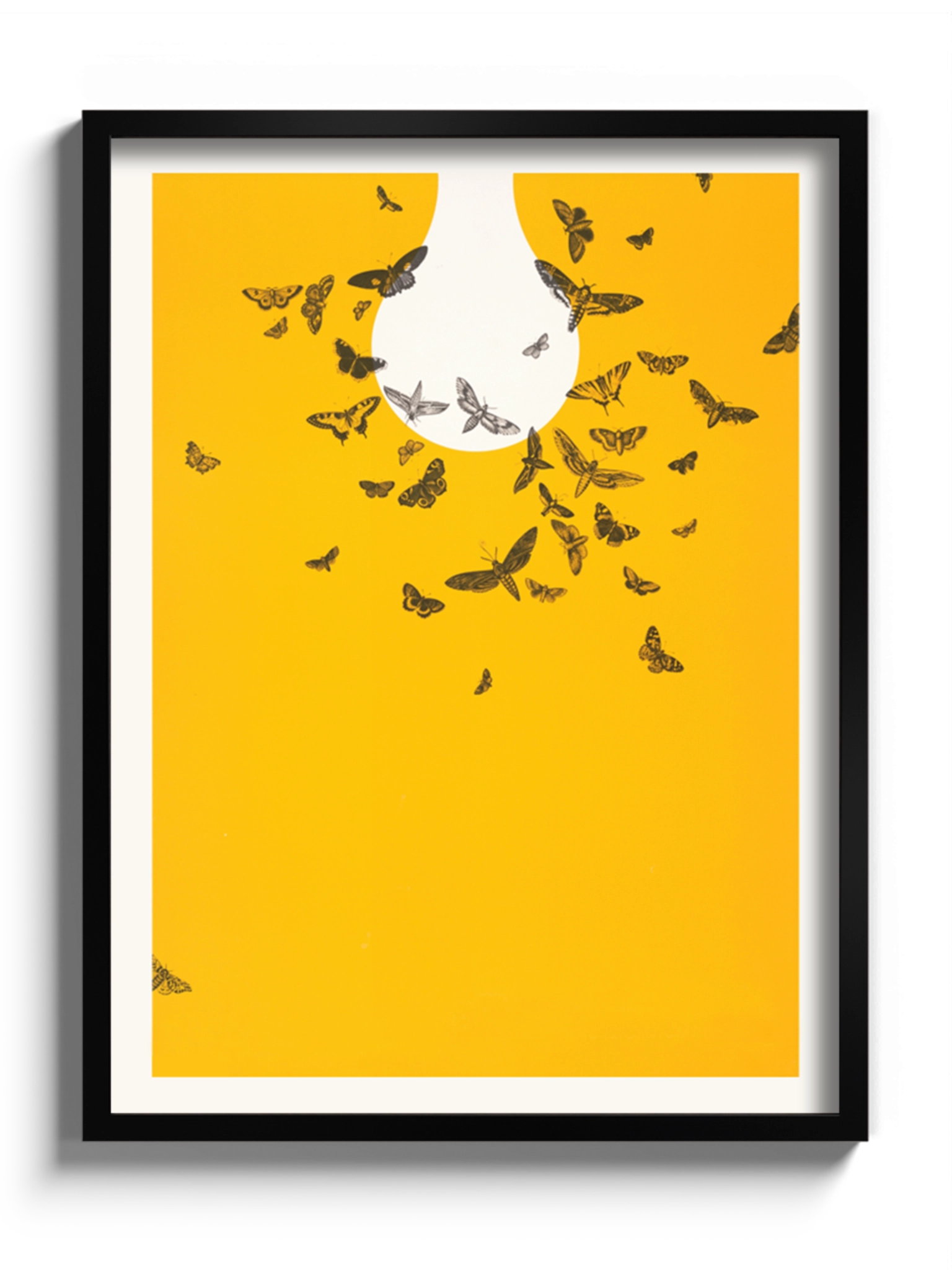 Постер створений американським графічним дизайнером Ken White. Жовтий колір, метелики, комахи.