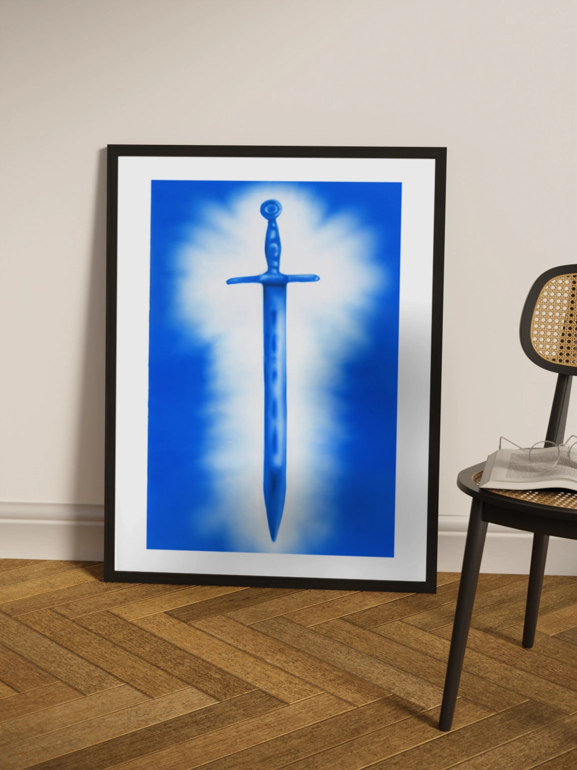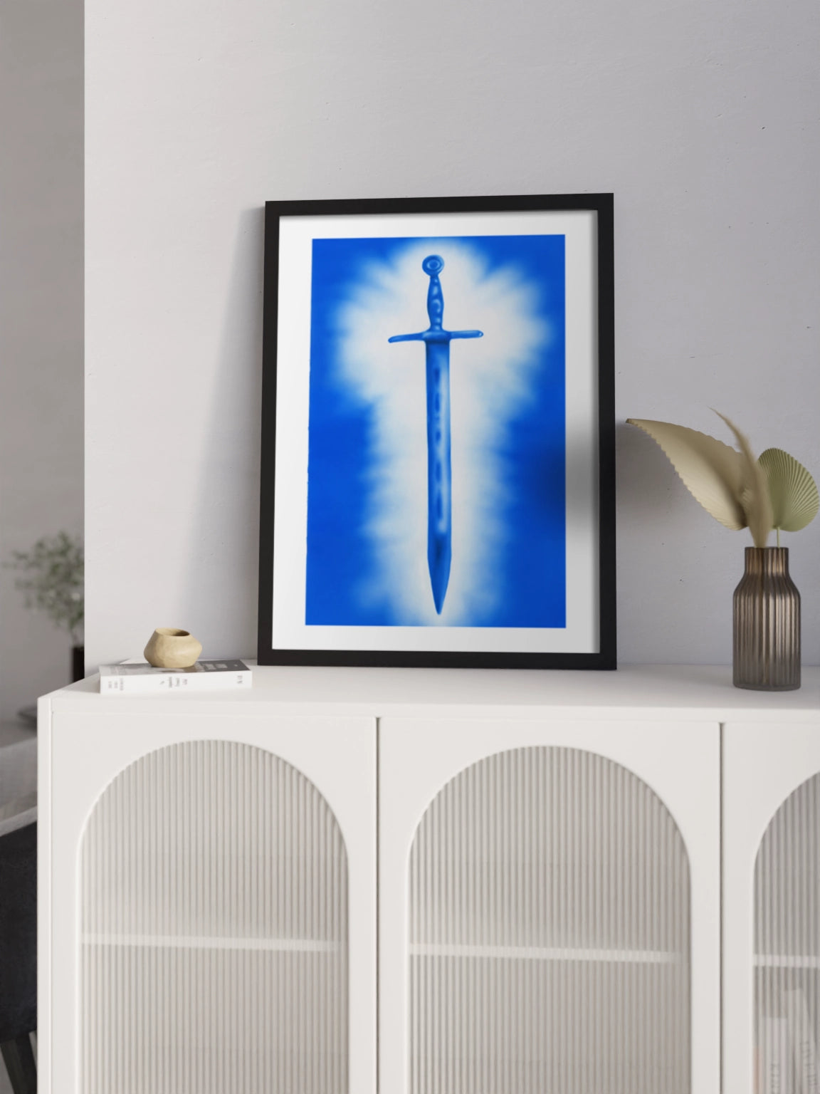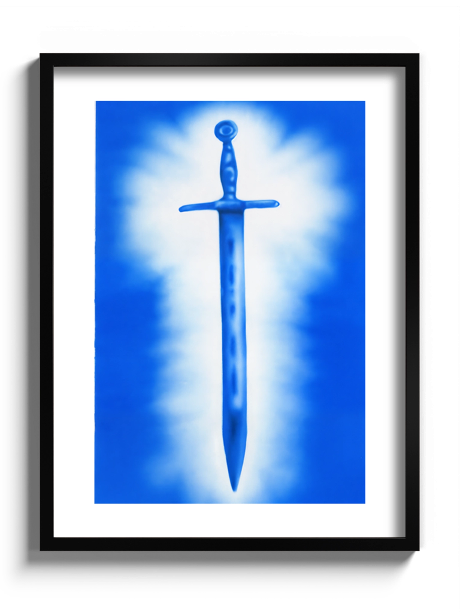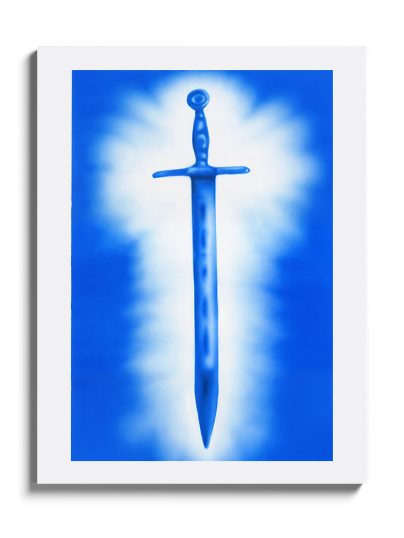 Сучасне мистецтво, картина синього та білого кольорів, меч, аерограф.