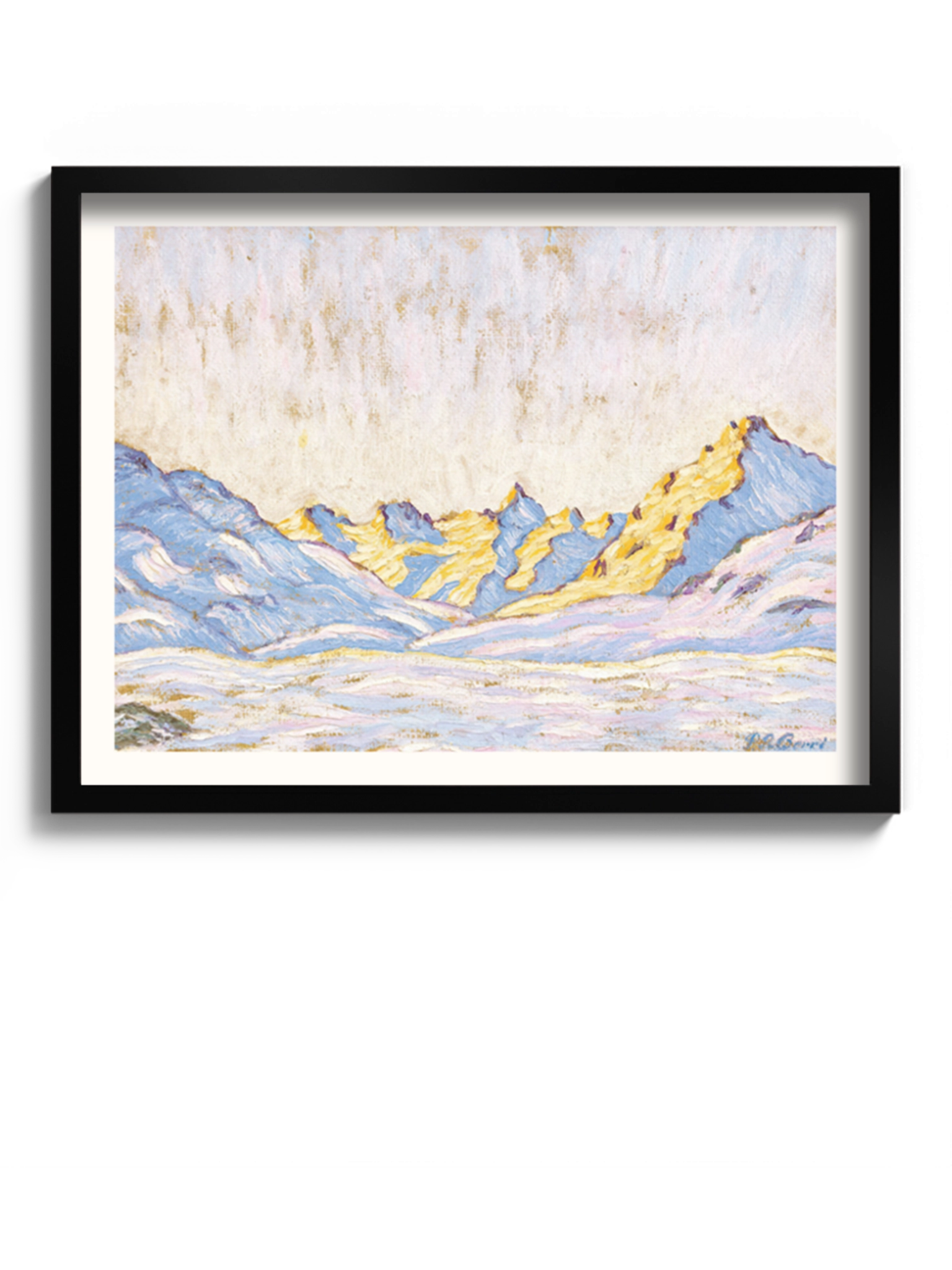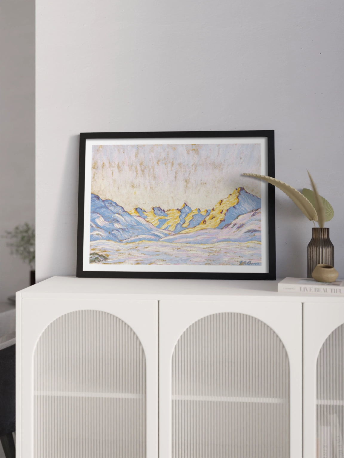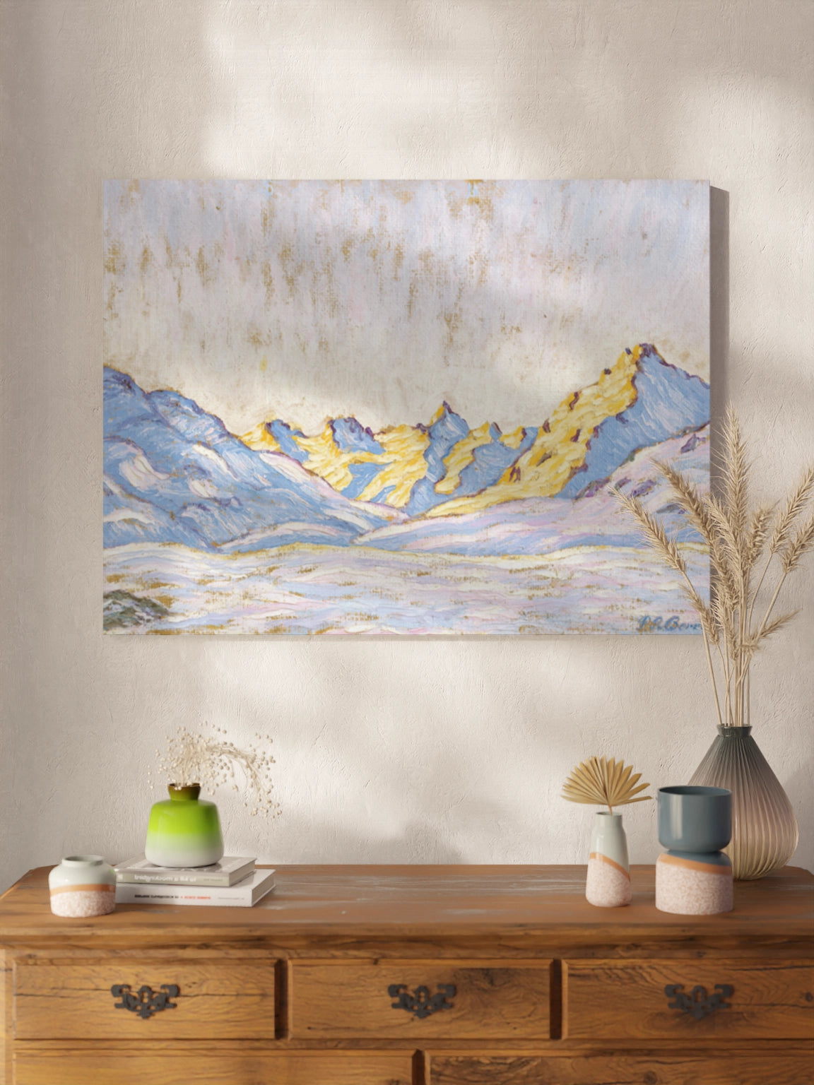 Картина із засніженими горами на полотні, склі та декорпанелі «Зимовий пейзаж». Картина швейцарського художника Петера Роберта Беррі. Картина стане гармонійним акцентом у вітальні, спальні, дитячій кімнаті, офісі або в закладі.