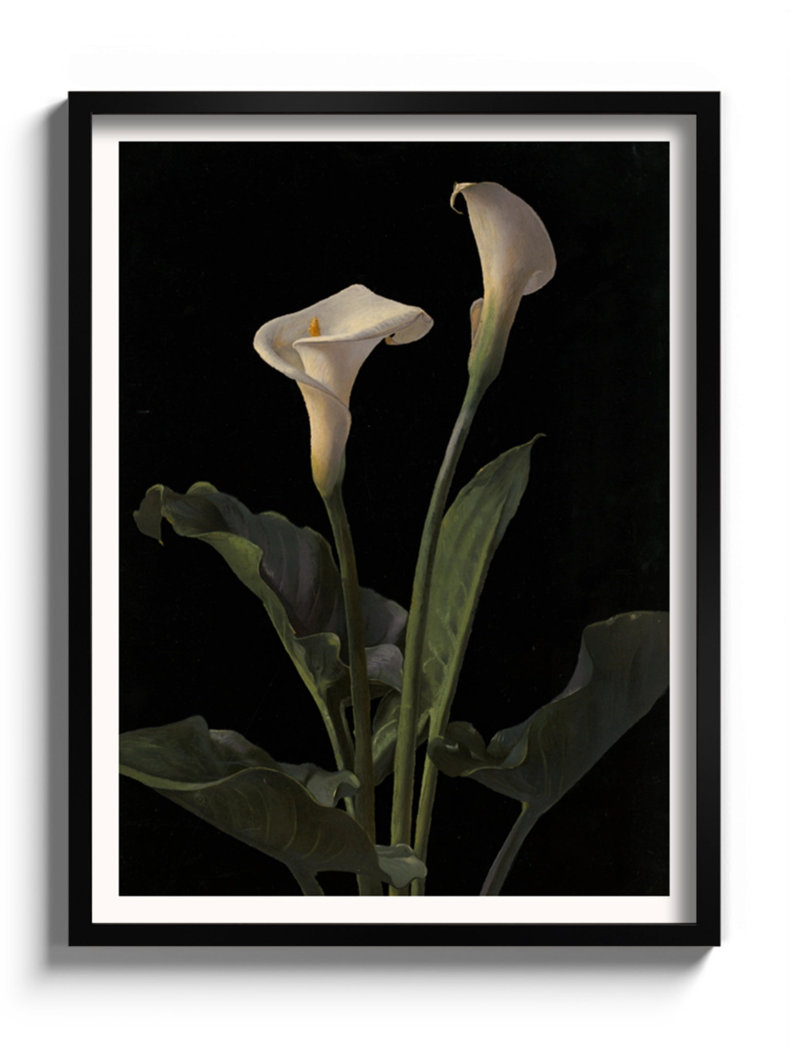 Картина з білими квітами на чорному фоні на полотні, склі та декорпанелі «Лілія Кала». Робота американського художника Джорджа Кокрана Ламбдіна. Зображення стане гармонійним акцентом у вітальні, спальні, дитячій кімнаті, офісі або в закладі.