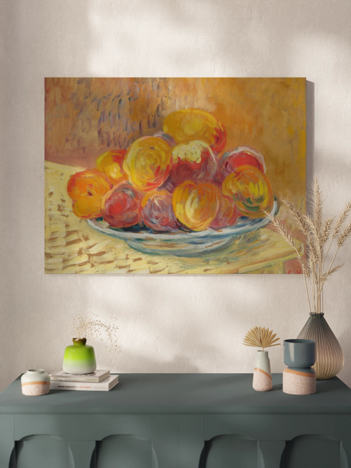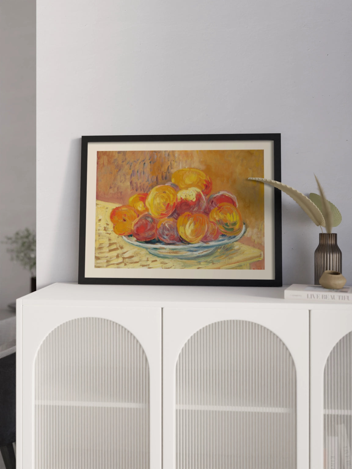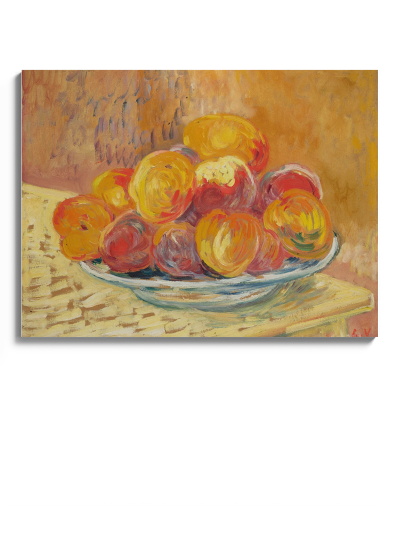 Картина на полотні, склі та декорпанелі «Натюрморт із персиками». Робота написана французьким художником Луї Вальта. Картина стане гармонійним акцентом у вітальні, спальні, дитячій кімнаті, офісі або в закладі.