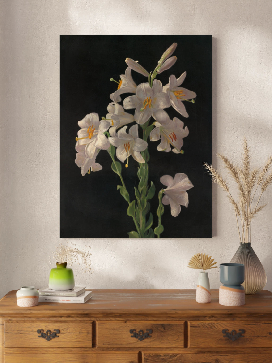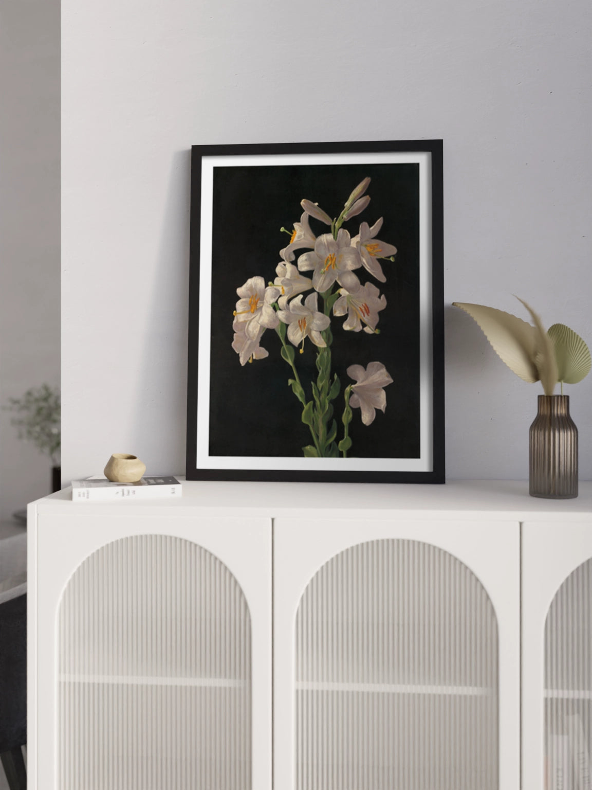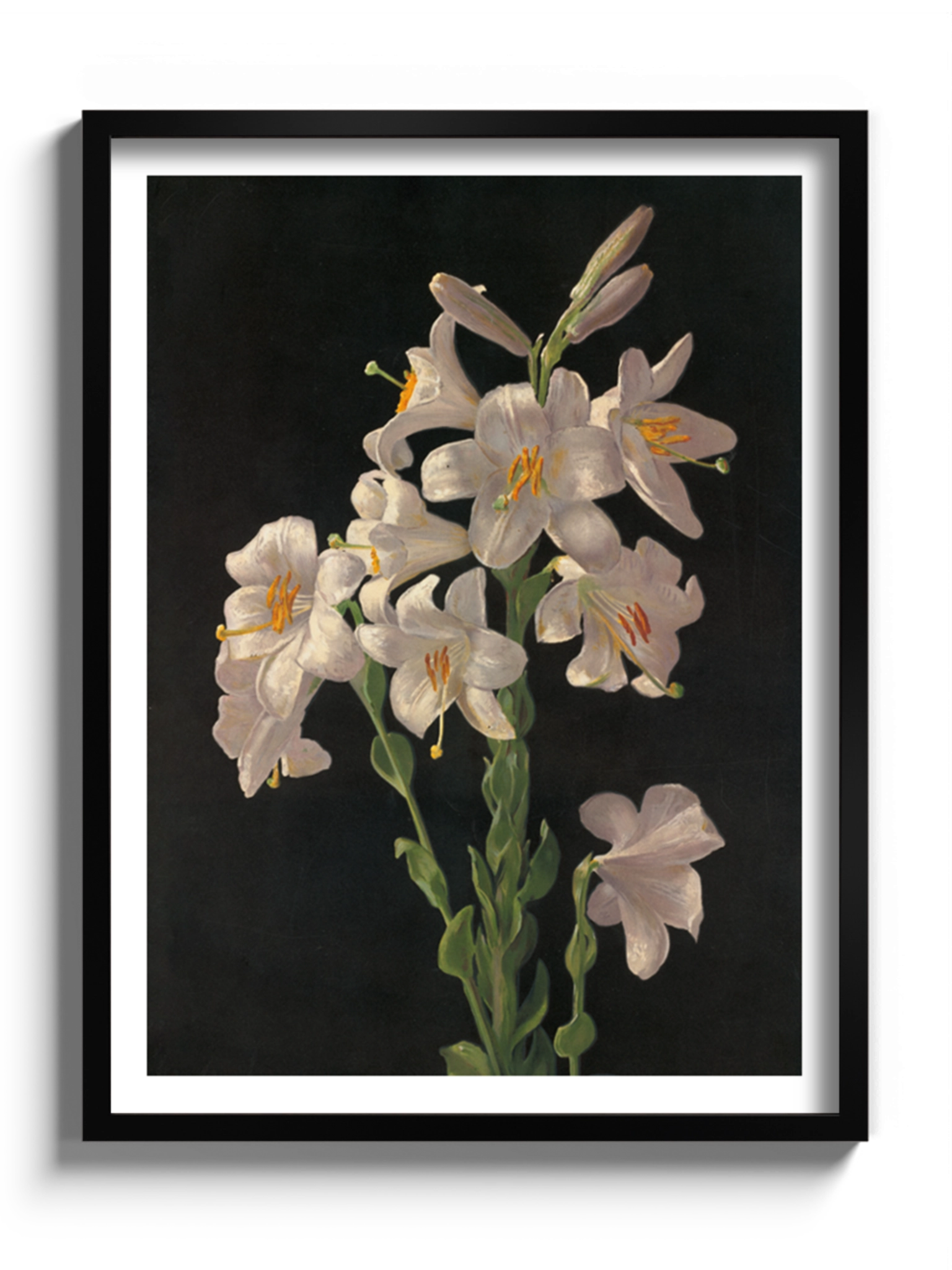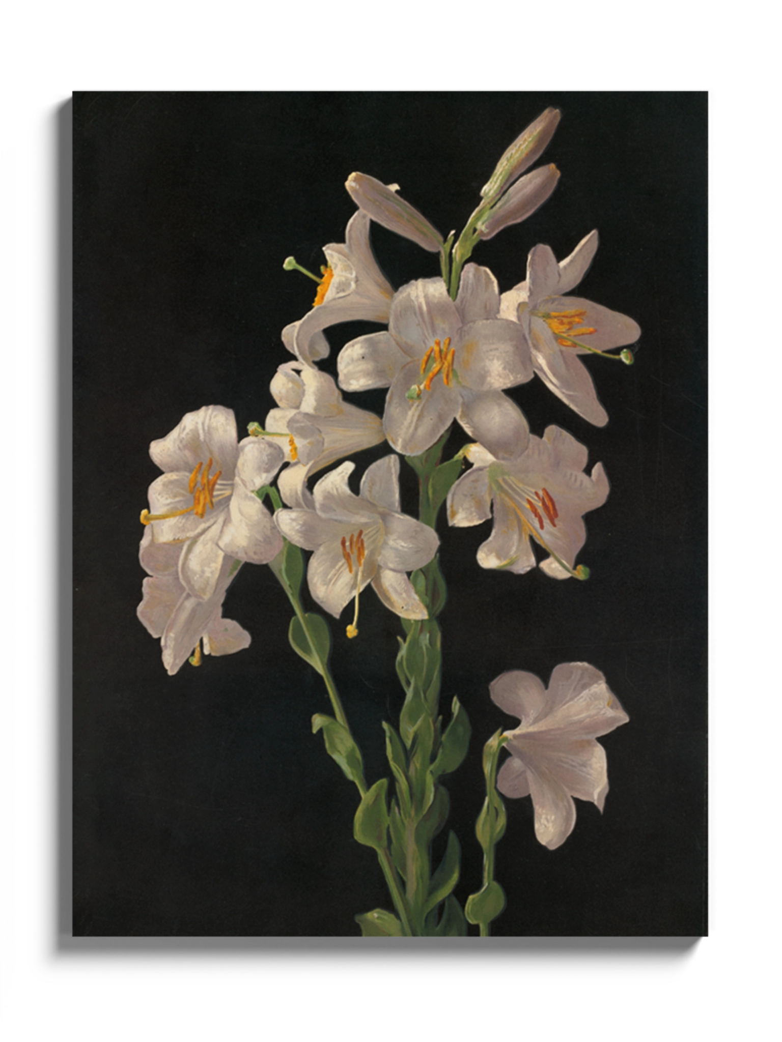 Картина з білими квітами на чорному фоні на полотні, склі та декорпанелі «Великодня лілія». Робота американського художника Джорджа Кокрана Ламбдіна. Зображення стане гармонійним акцентом у вітальні, спальні, дитячій кімнаті, офісі або в закладі.