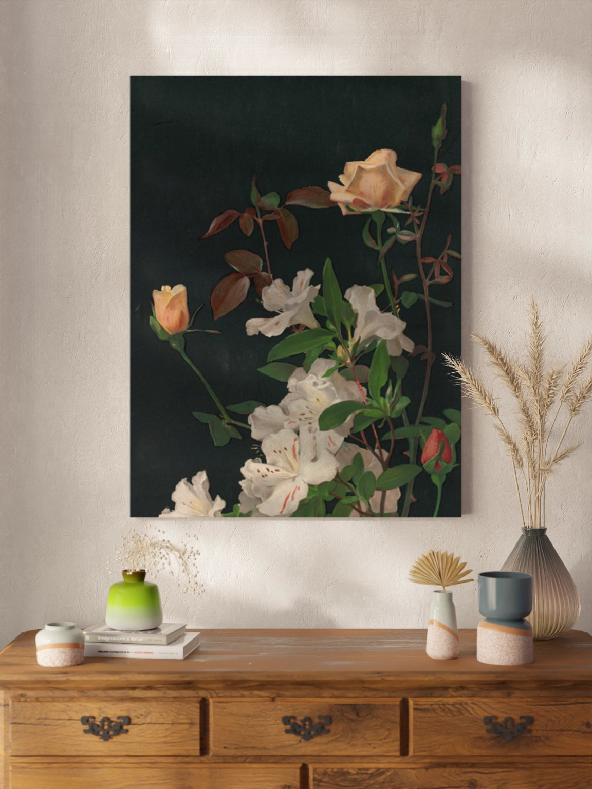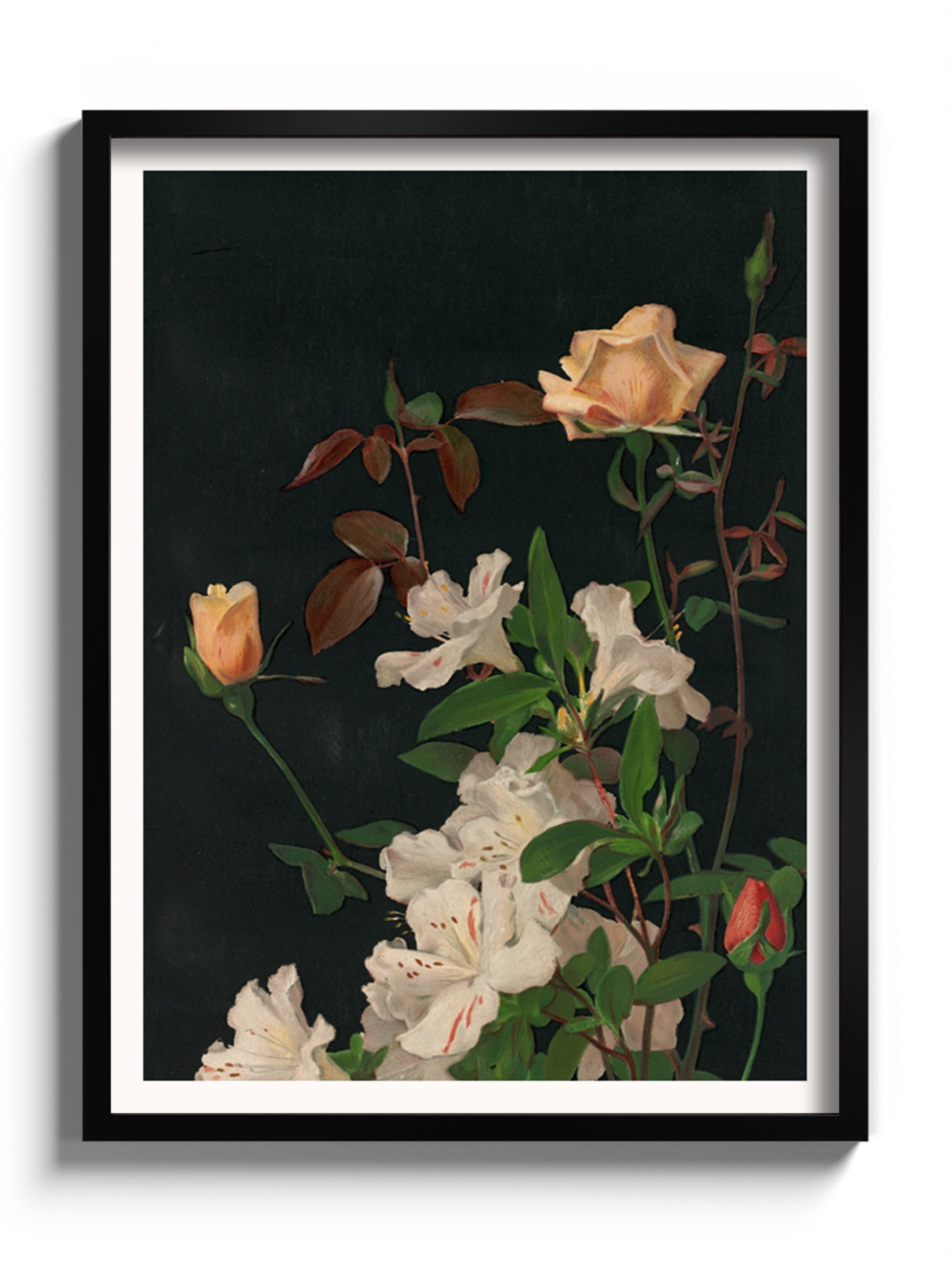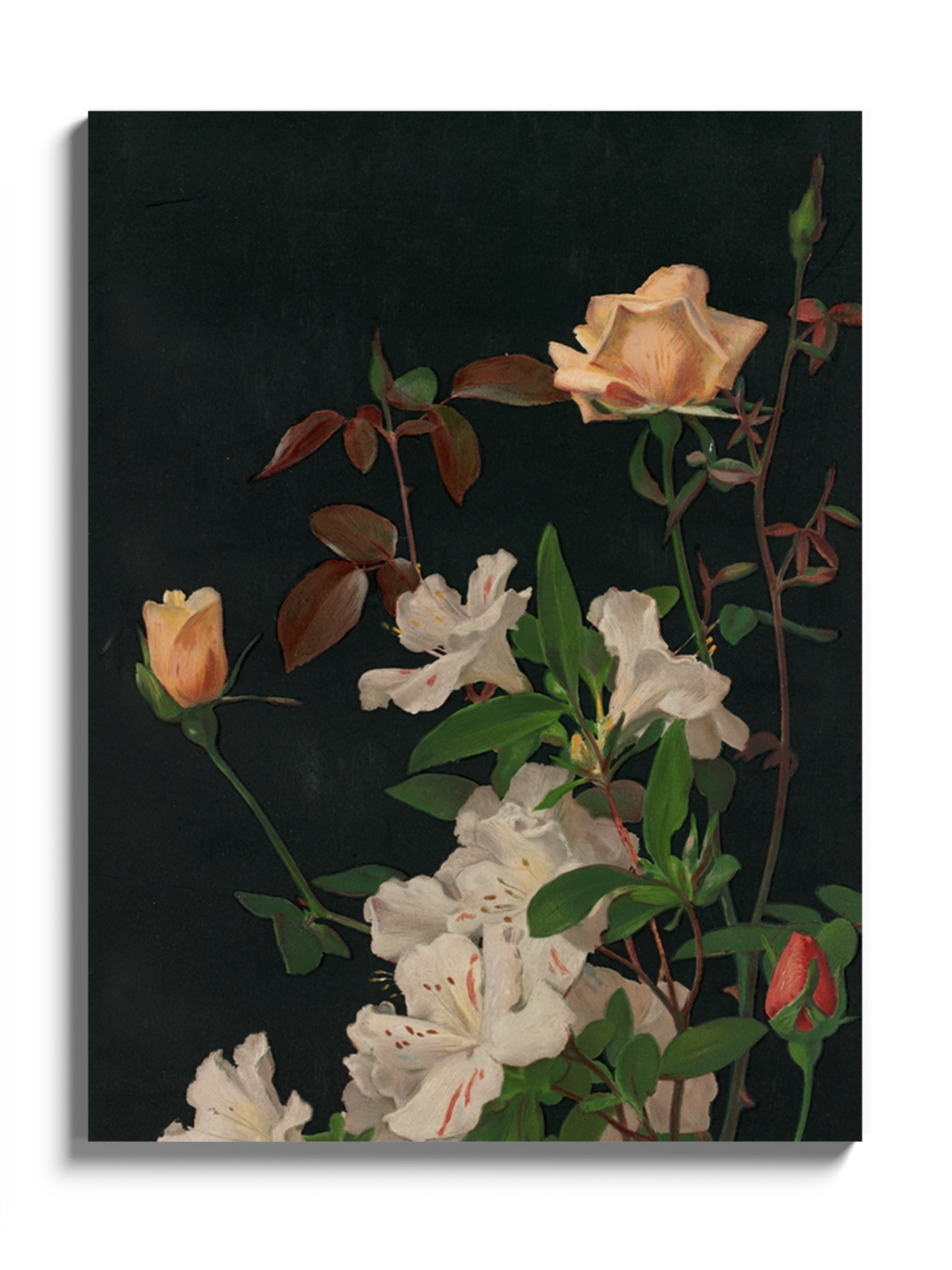 Картина з квітами на чорному фоні на полотні, склі та декорпанелі «Азалії та троянди». Робота американського художника Джорджа Кокрана Ламбдіна. Зображення стане гармонійним акцентом у вітальні, спальні, дитячій кімнаті, офісі або в закладі.