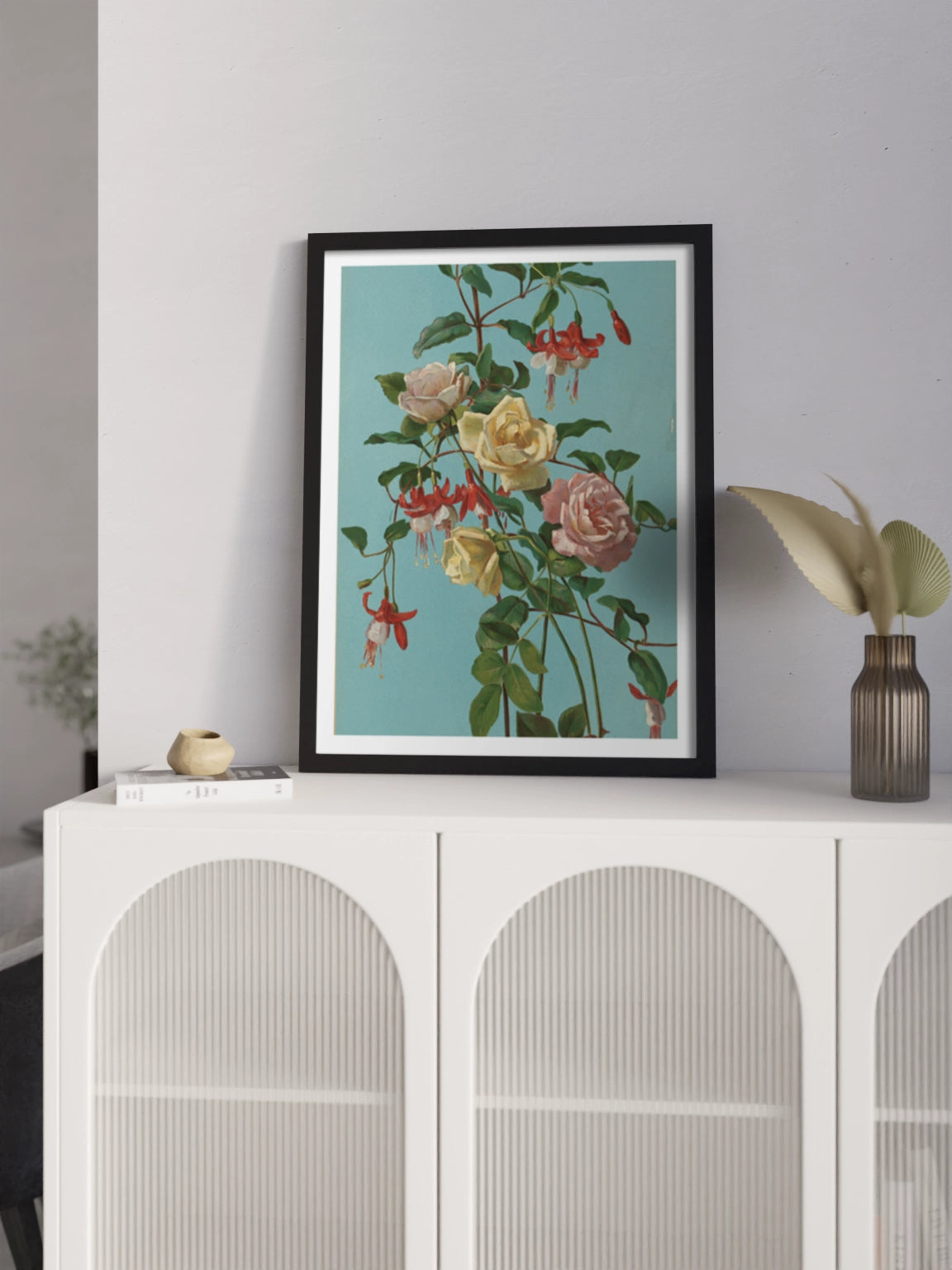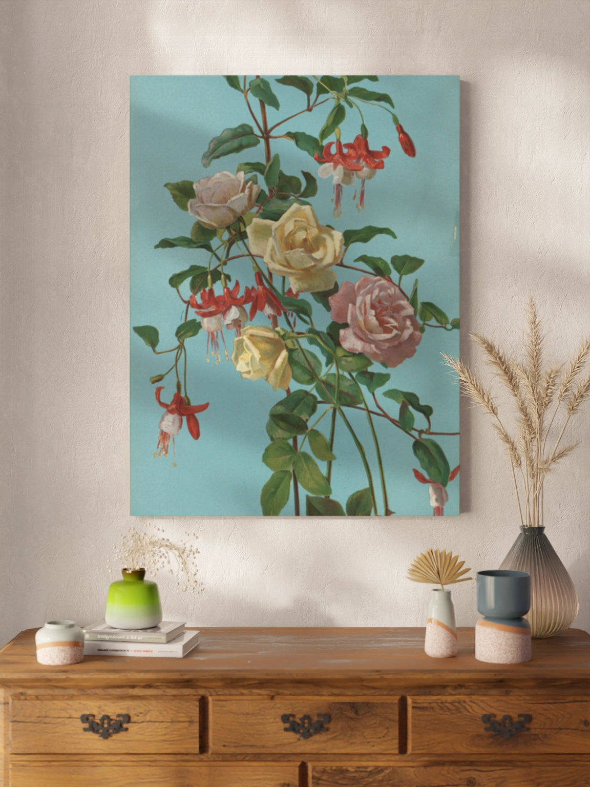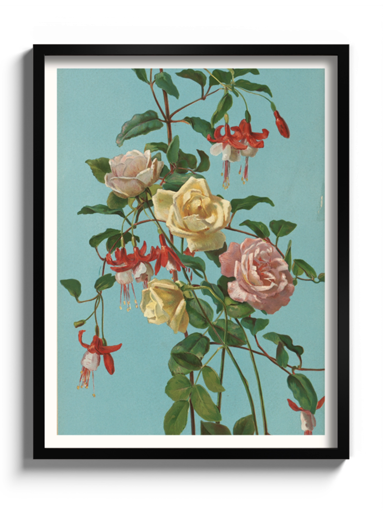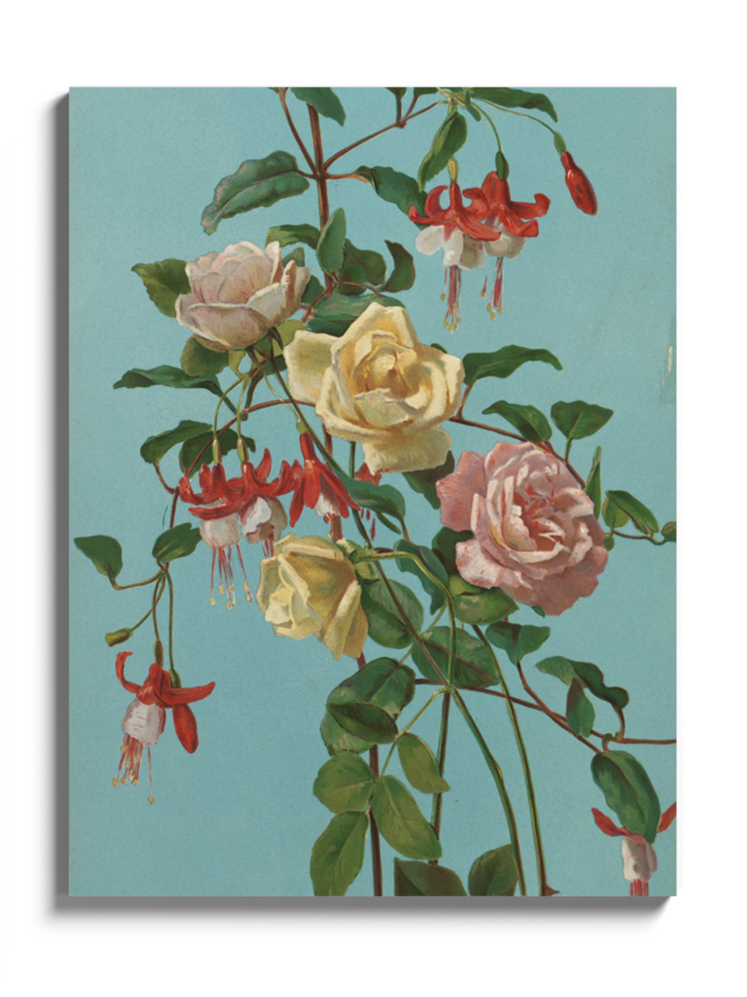 Картина з квітами на блакитному фоні на полотні, склі та декорпанелі «Троянди та фуксія». Робота американського художника Джорджа Кокрана Ламбдіна. Зображення стане гармонійним акцентом у вітальні, спальні, дитячій кімнаті, офісі або в закладі.