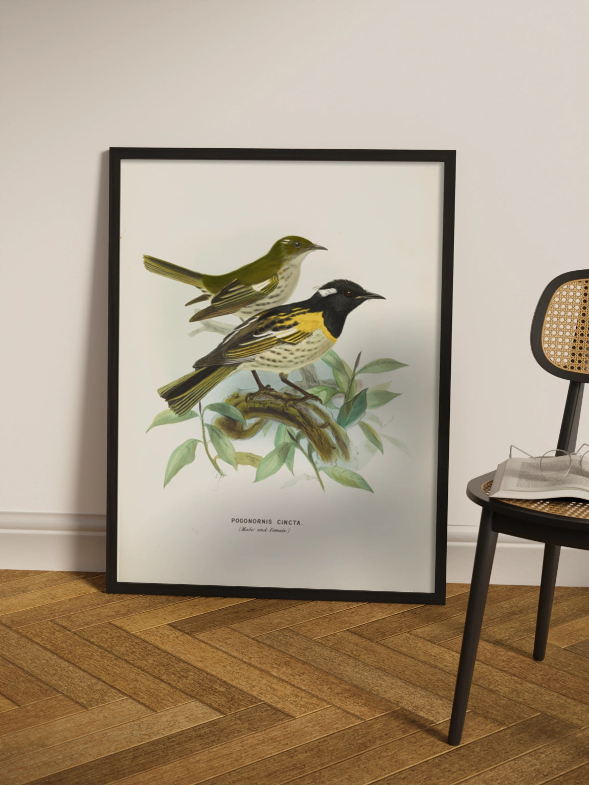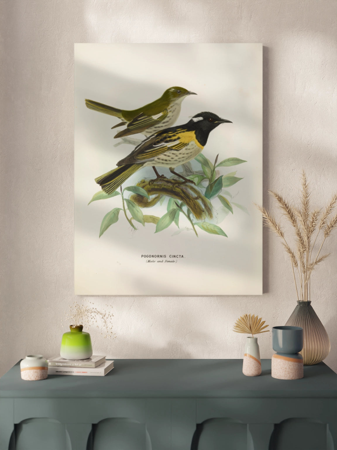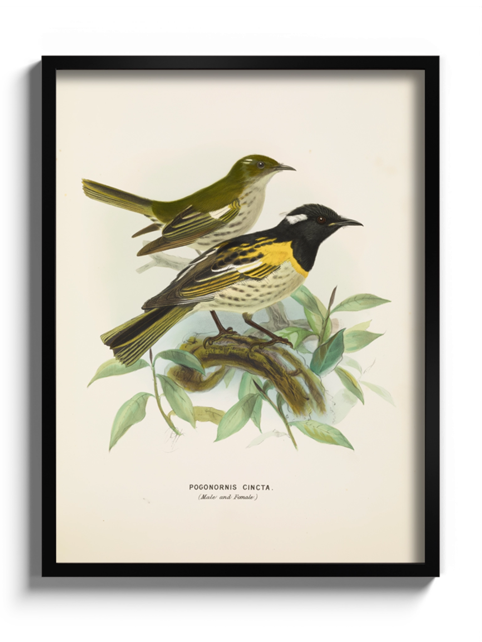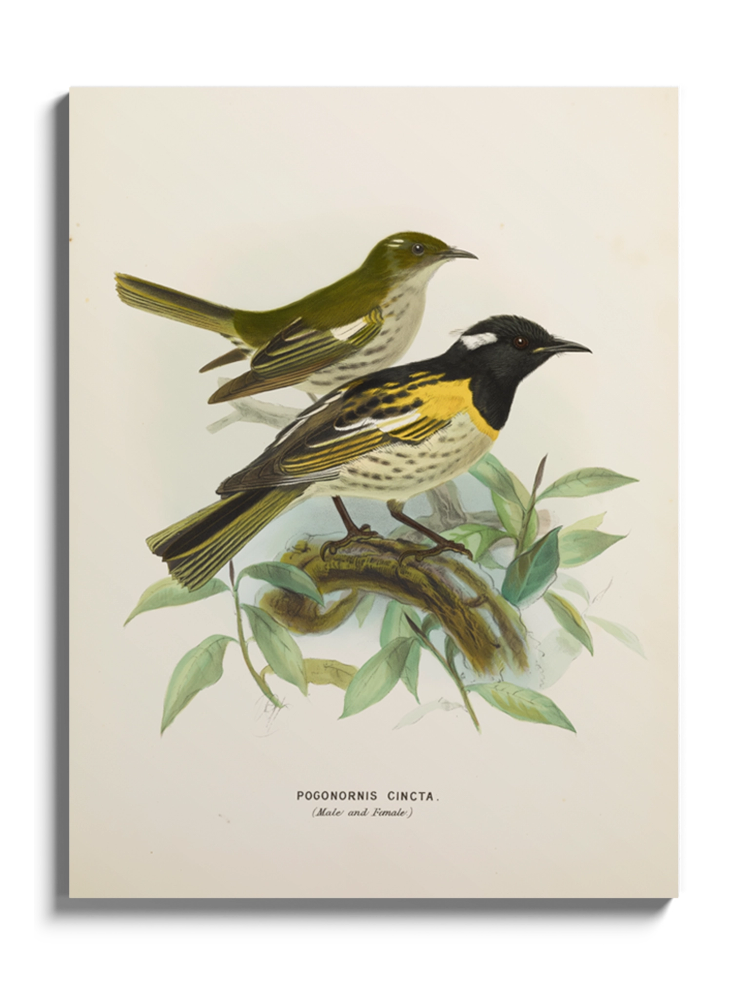 Картина з пташками на полотні, склі та декорпанелі «Медосос Новозеландський» -  друкована картина для сучасного інтер’єру. Робота художника John Gerrard Keulemans, вінтажна натуралістична ілюстрація стане гармонійним акцентом у вітальні, спальні, дитячій кімнаті, офісі або громадському просторі.