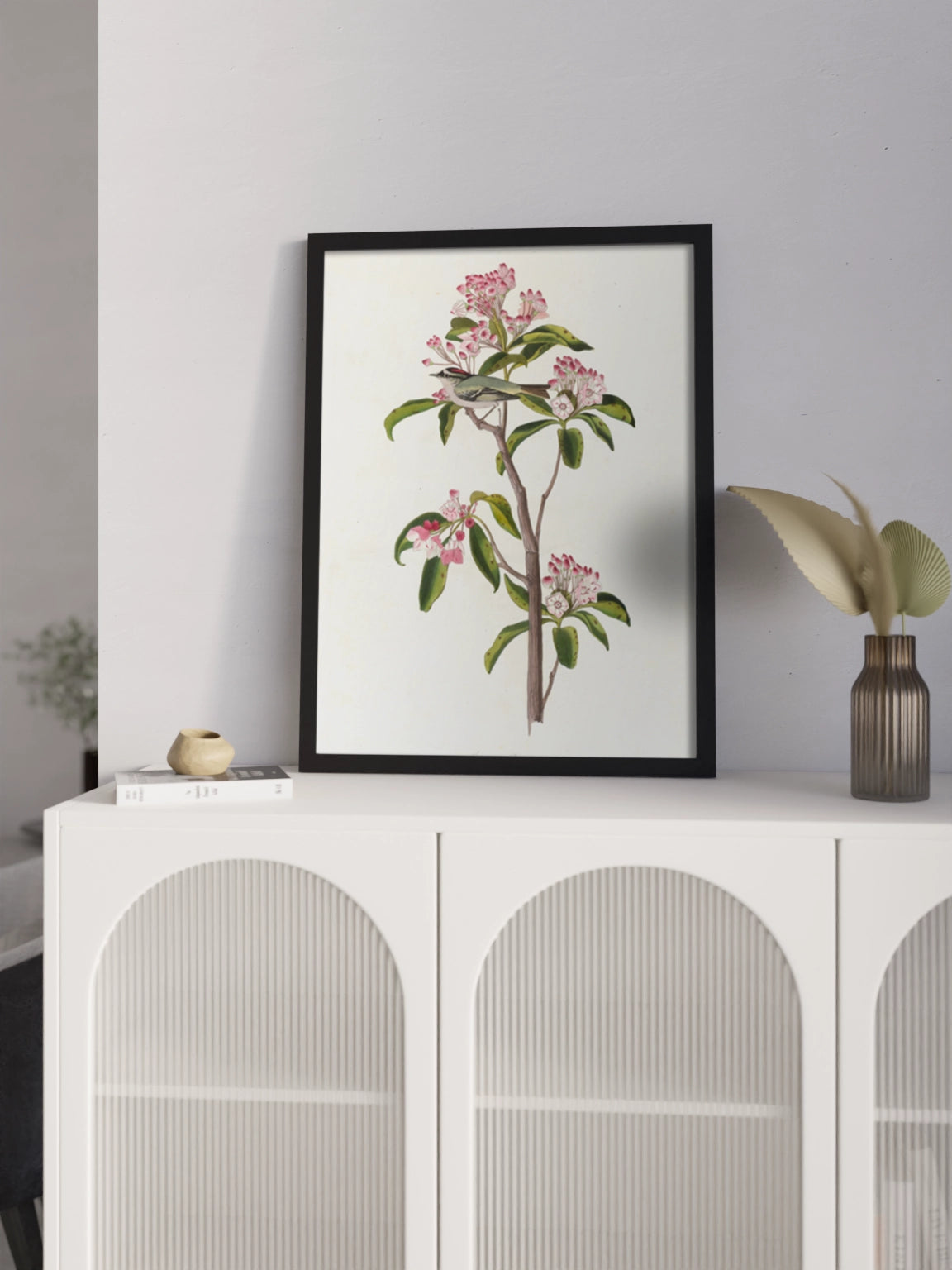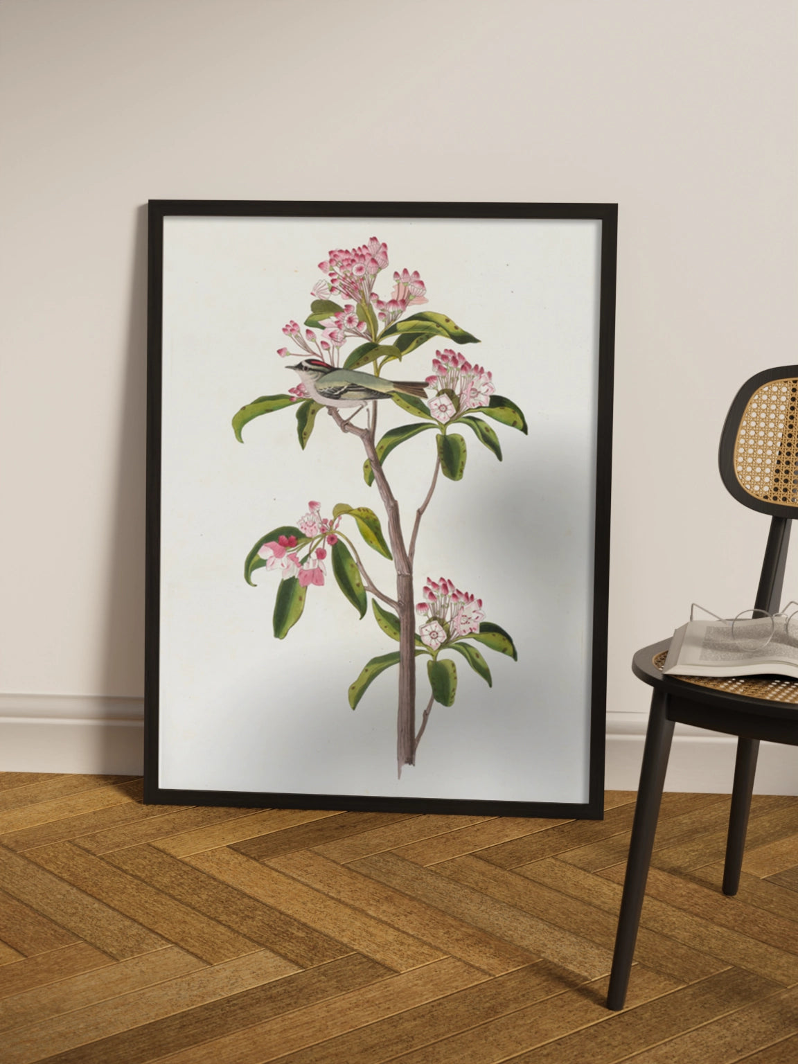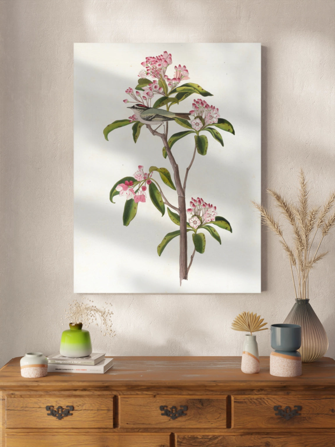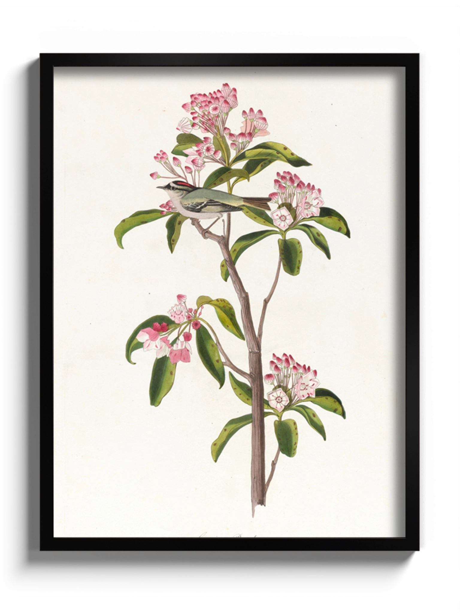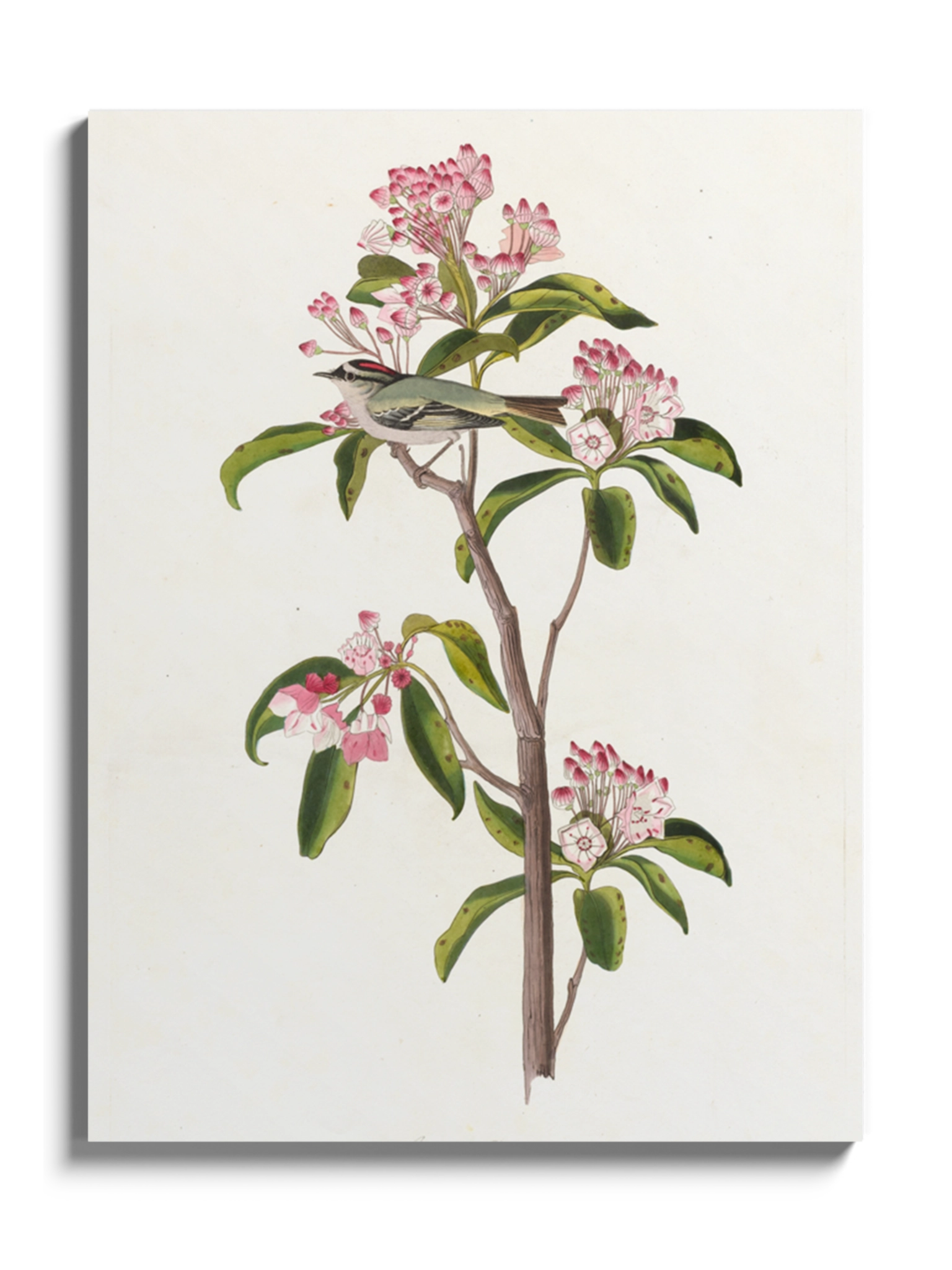 Картина з милою пташкою на гілці з рожевими квітами на полотні, склі та декорпанелі «Пташка Золотомушка» -  друкована картина для інтер’єру. Ілюстрація американського натураліста та орнітолога Джона Джеймса Одюбон стане гармонійним акцентом у вітальні, спальні, дитячій кімнаті, офісі або громадському просторі.