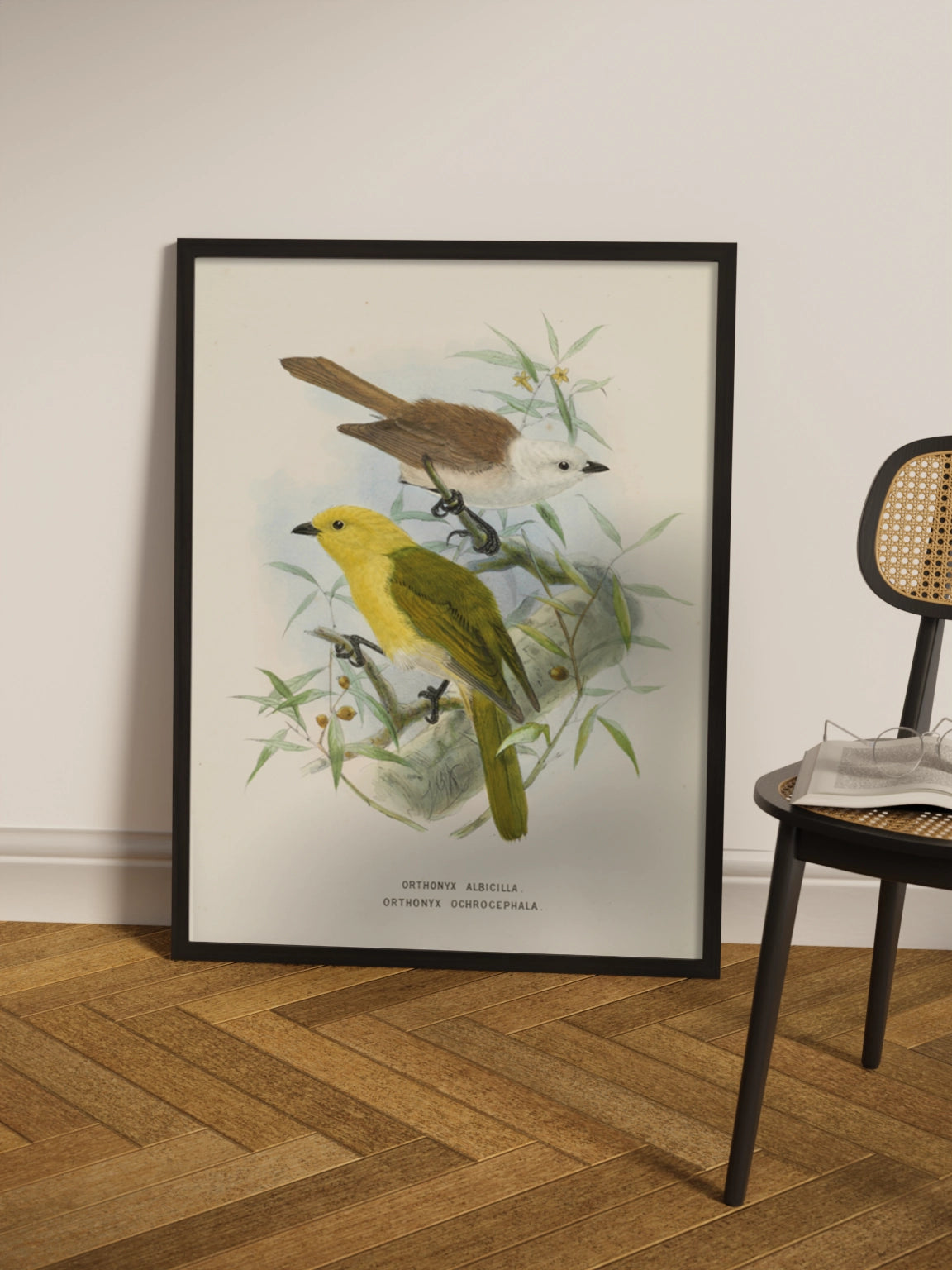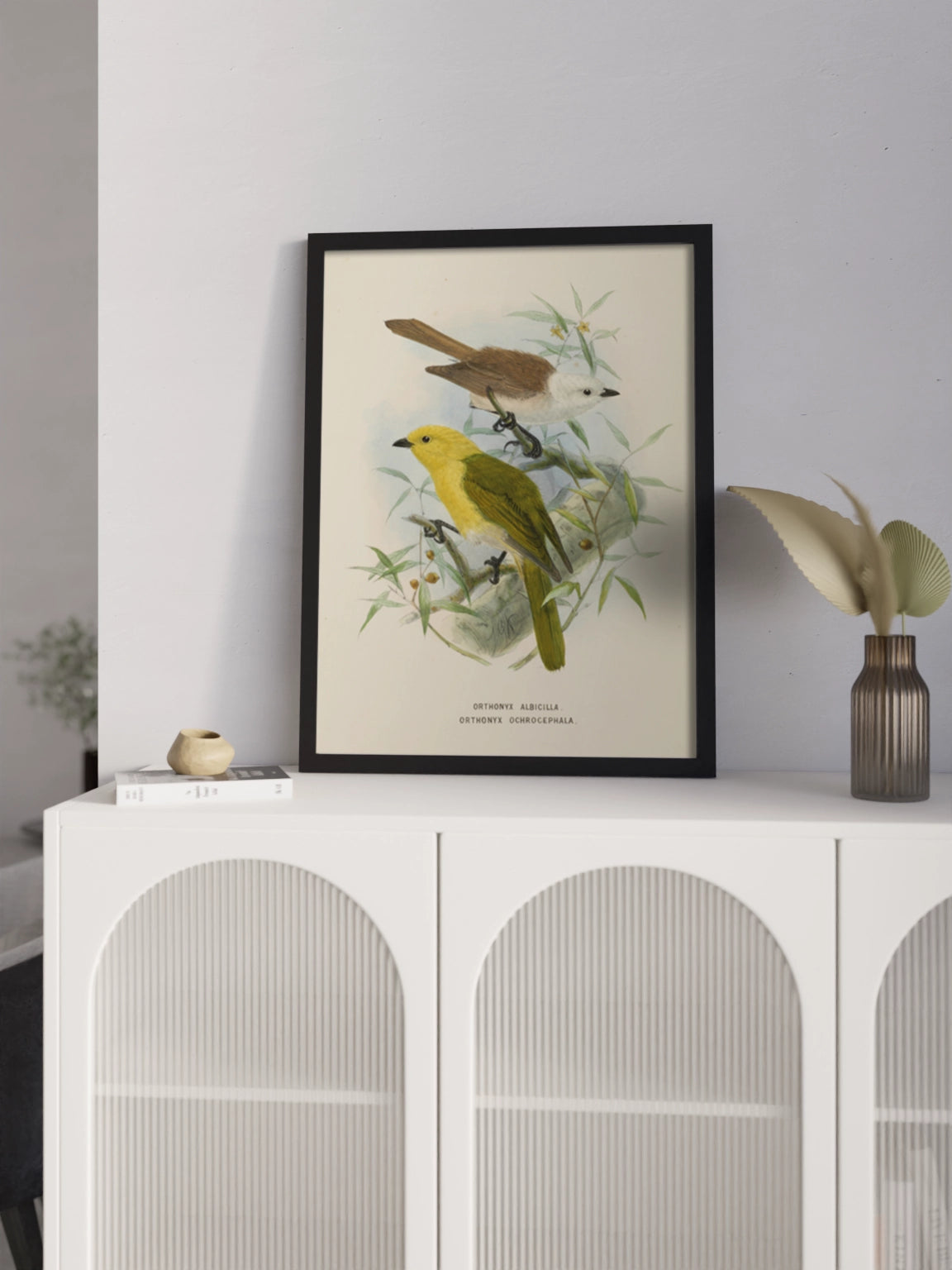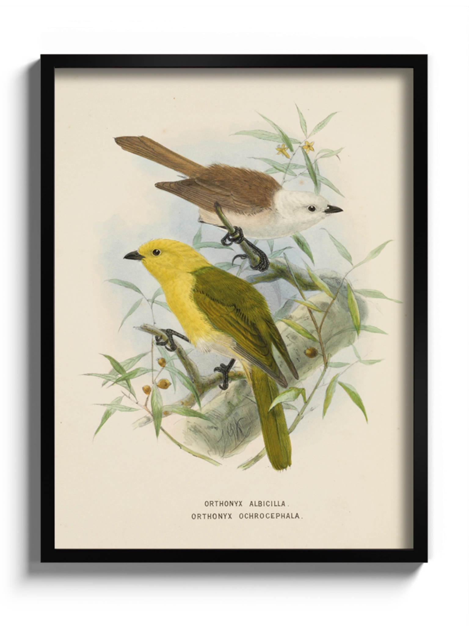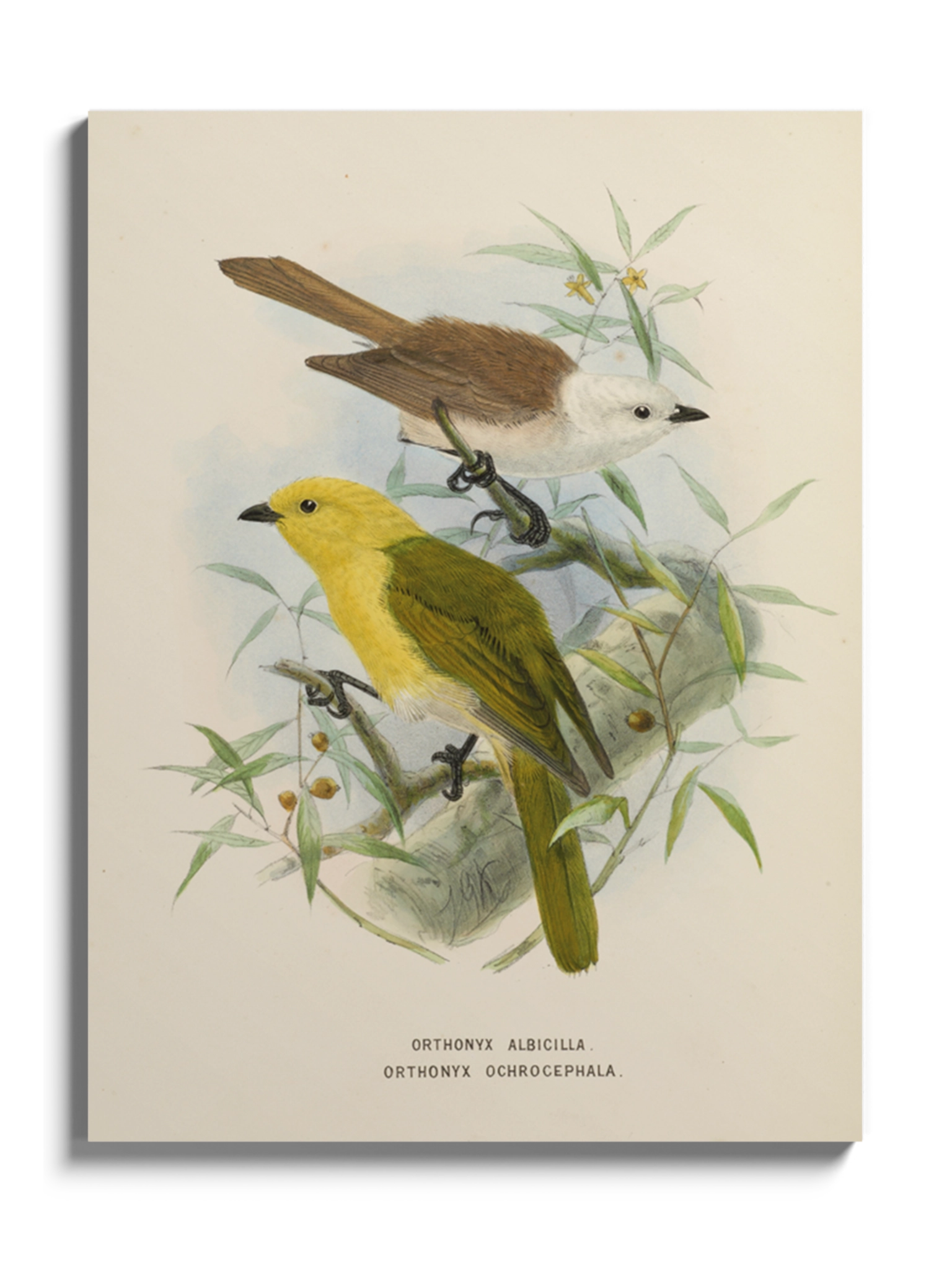 Картина з яскравими пташками на полотні, склі та декорпанелі «Дві пташки на гілці» - друкована картина для інтер’єру. Зображення створене нідерландським ілюстратором John Gerrard Keulemans, вінтажна натуралістична ілюстрація стане гармонійним акцентом у вітальні, спальні, дитячій кімнаті, офісі або громадському просторі.