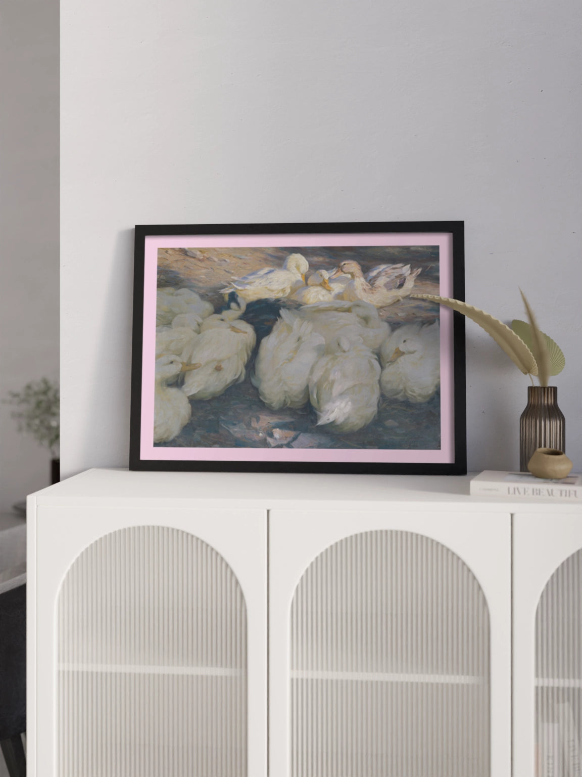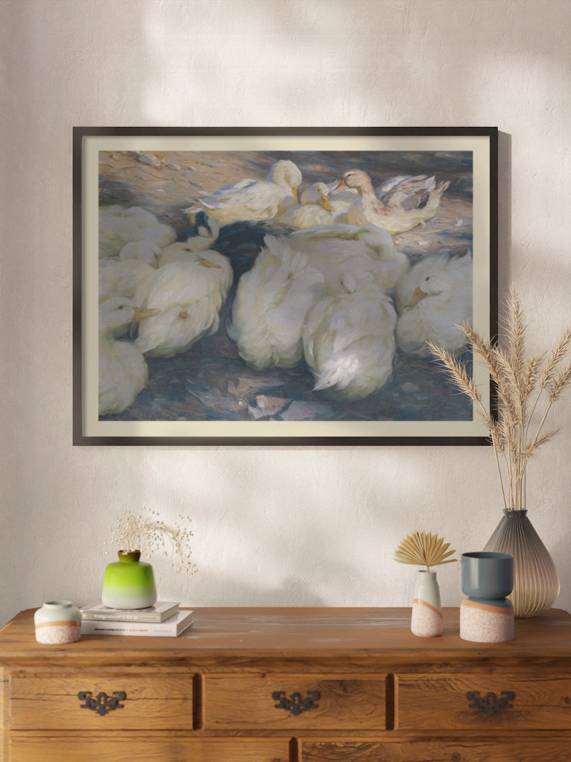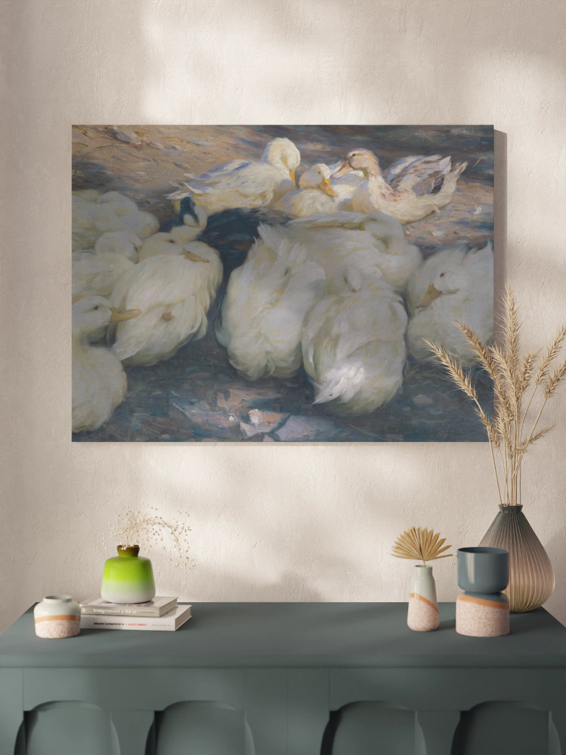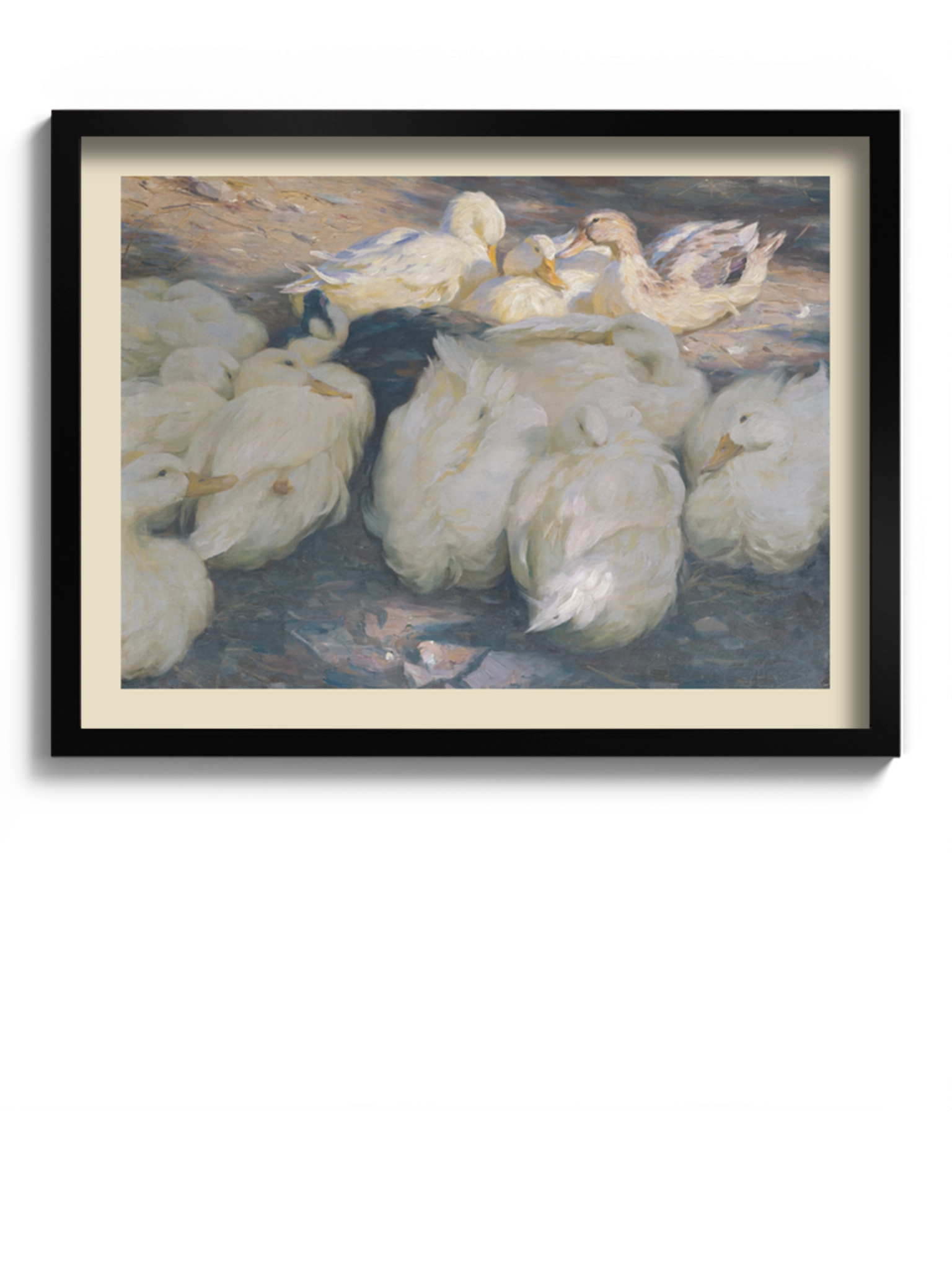 Картина з білими качками на полотні, склі та декорпанелі «У вечірньому сонці» -  друкована картина для інтер’єру. Робота німецького художника Александера Кьостера, картина стане гармонійним акцентом у вітальні, спальні, дитячій кімнаті, офісі або громадському просторі.