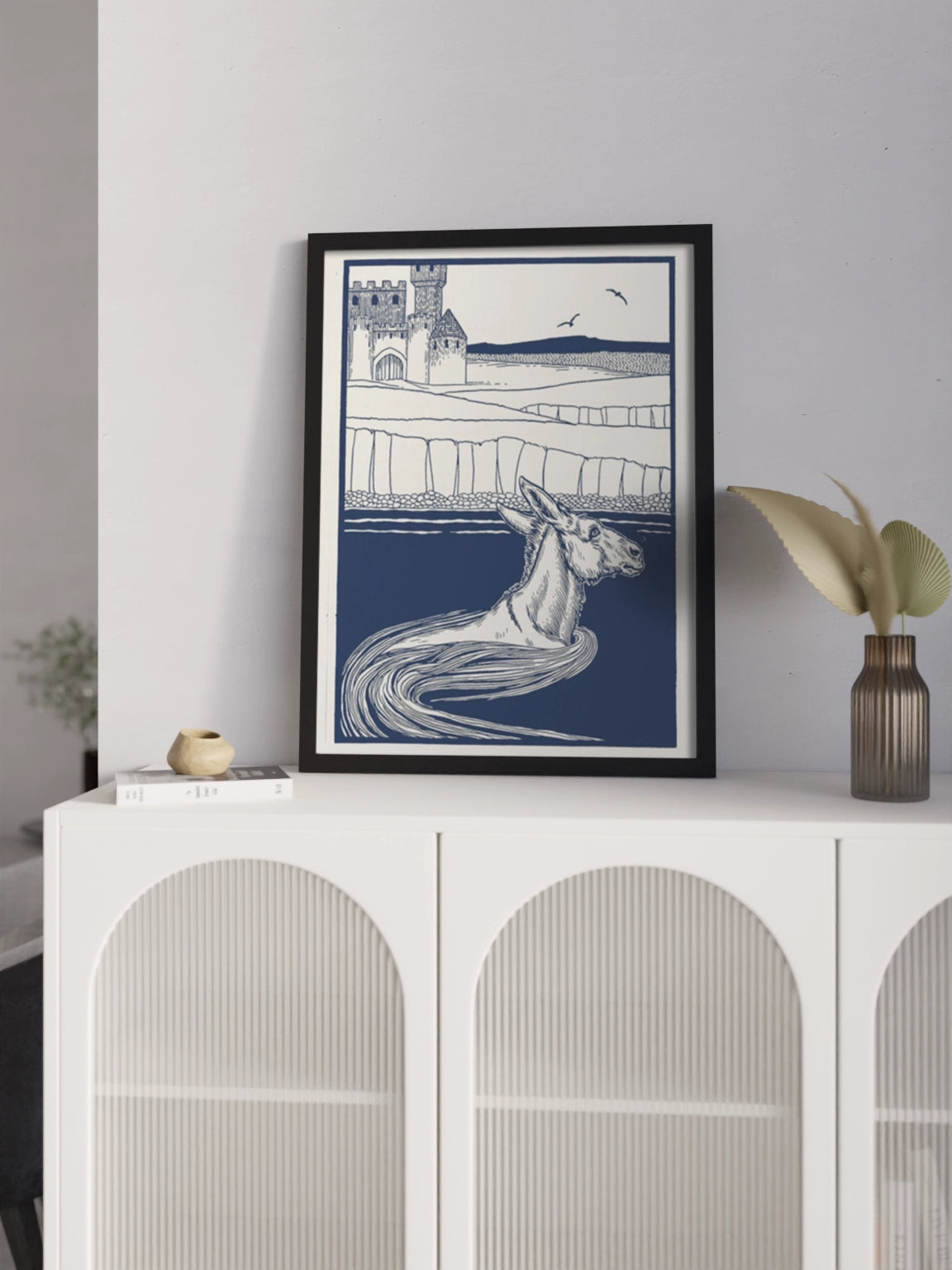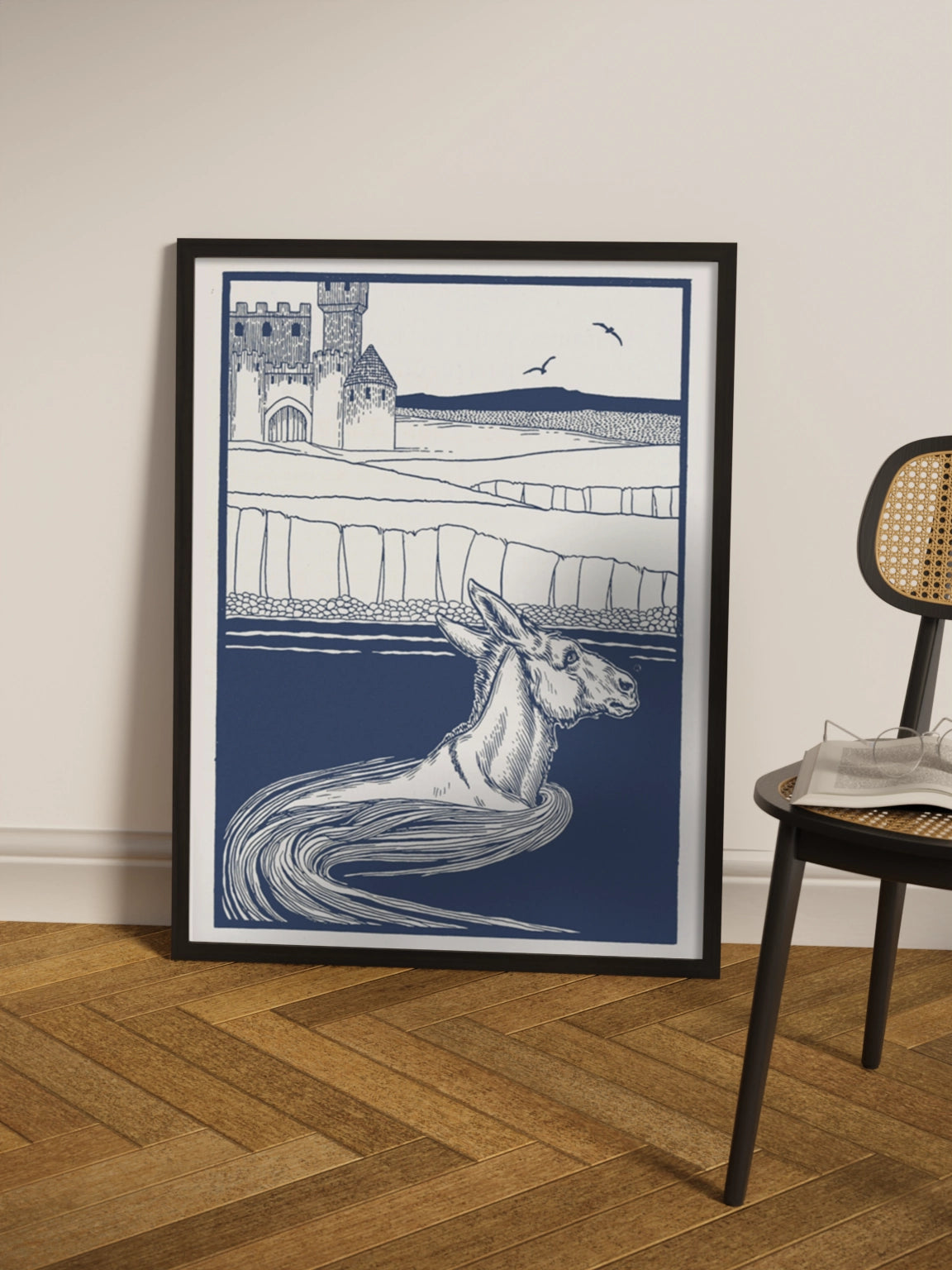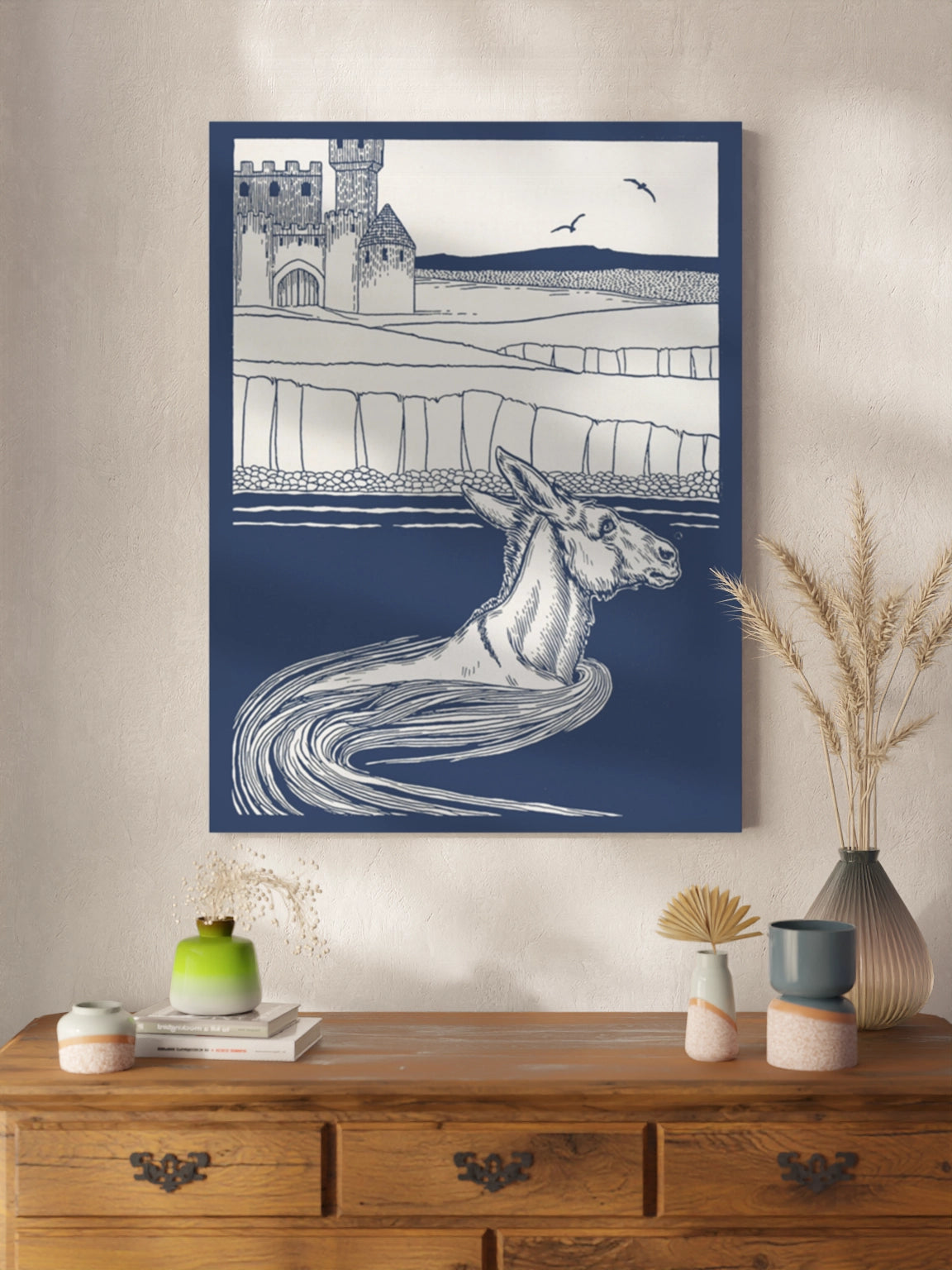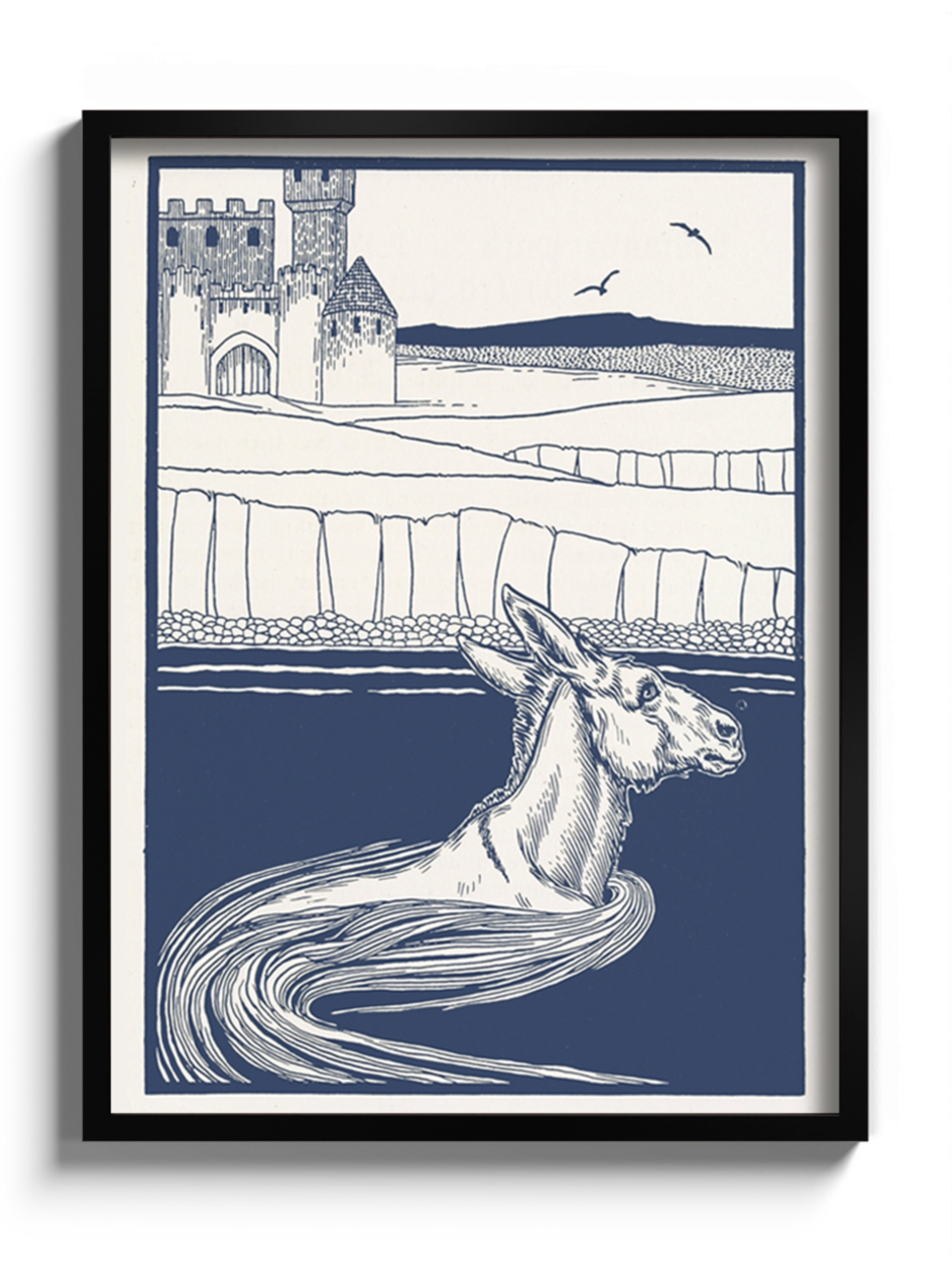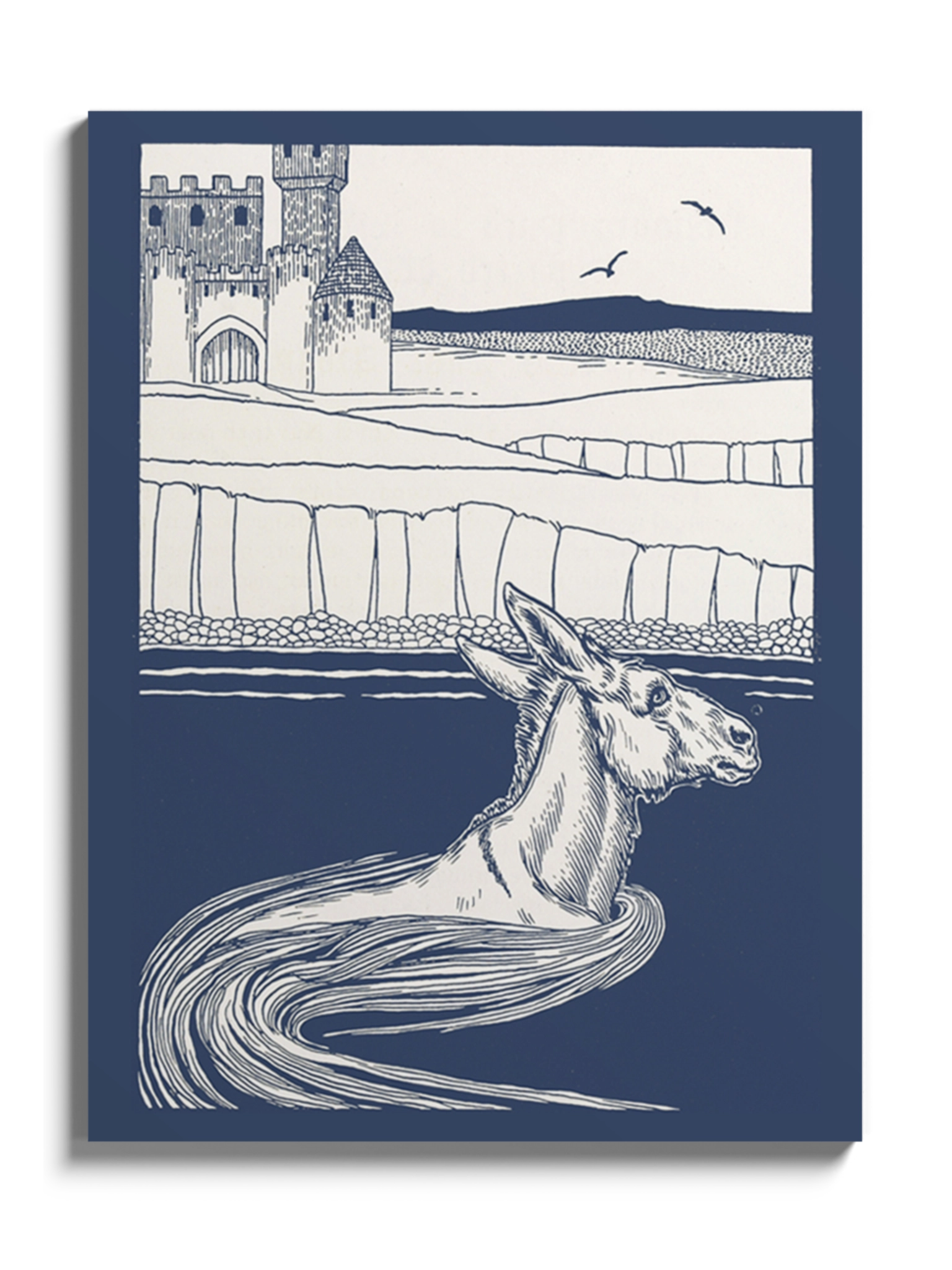 Картина з віслюком у воді в синіх кольорах на полотні, склі та декорпанелі. Це ілюстрація з книги Персі Дж. Біллінґхерста " A Hundred Anecdotes of Animals". Вінтажна картина стане гармонійним акцентом у вітальні, спальні, дитячій кімнаті, офісі або громадському просторі.
